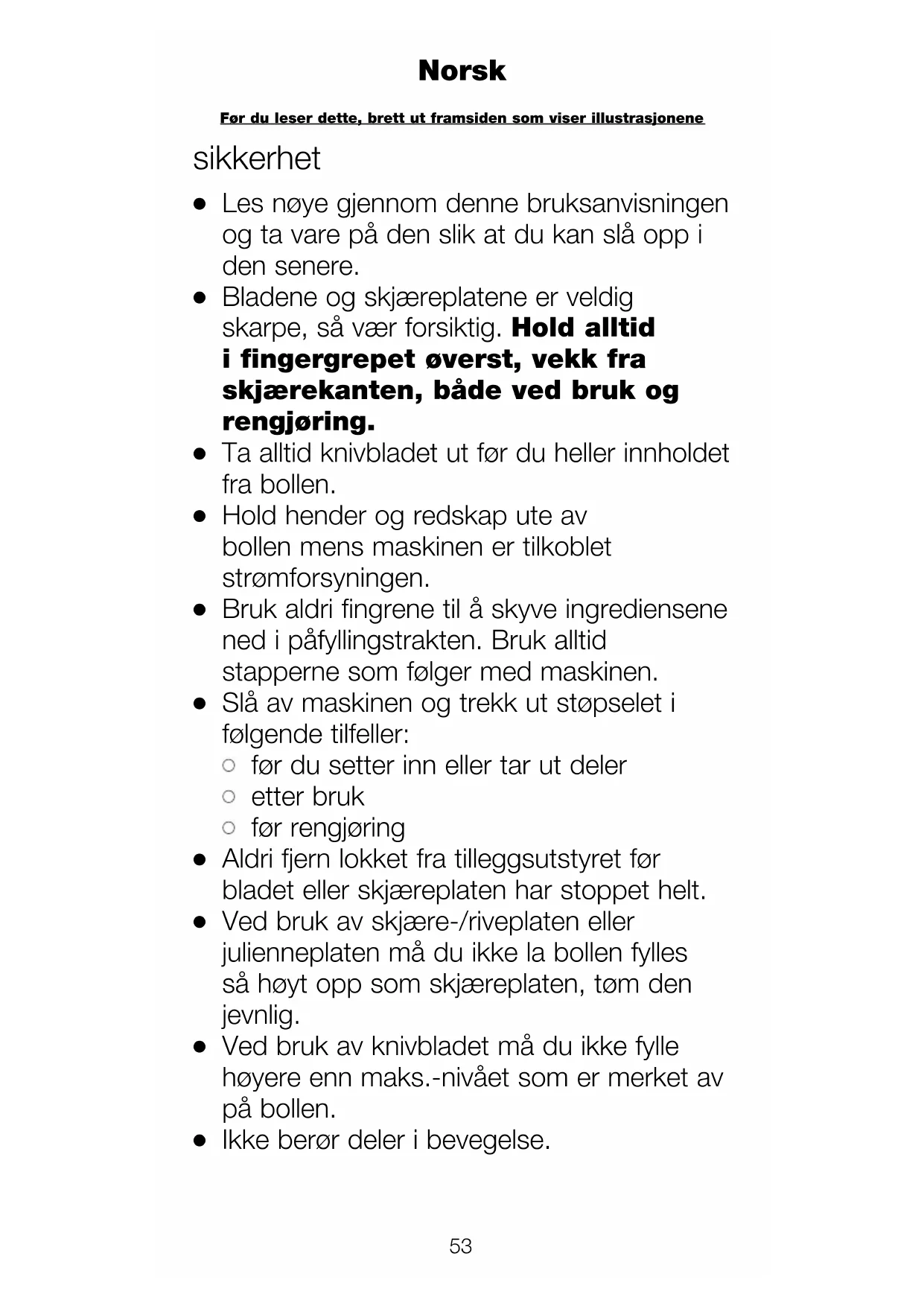 Aldri bruk skadet tilleggsutstyr. Få det ettersett eller reparert. Se “service og kundetjeneste”. Se i instruksjonsboken for hovedkjøkkenmaskinen for ekstra sikkerhetsvarsler. 54før du bruker ditt Kenwood- redskap