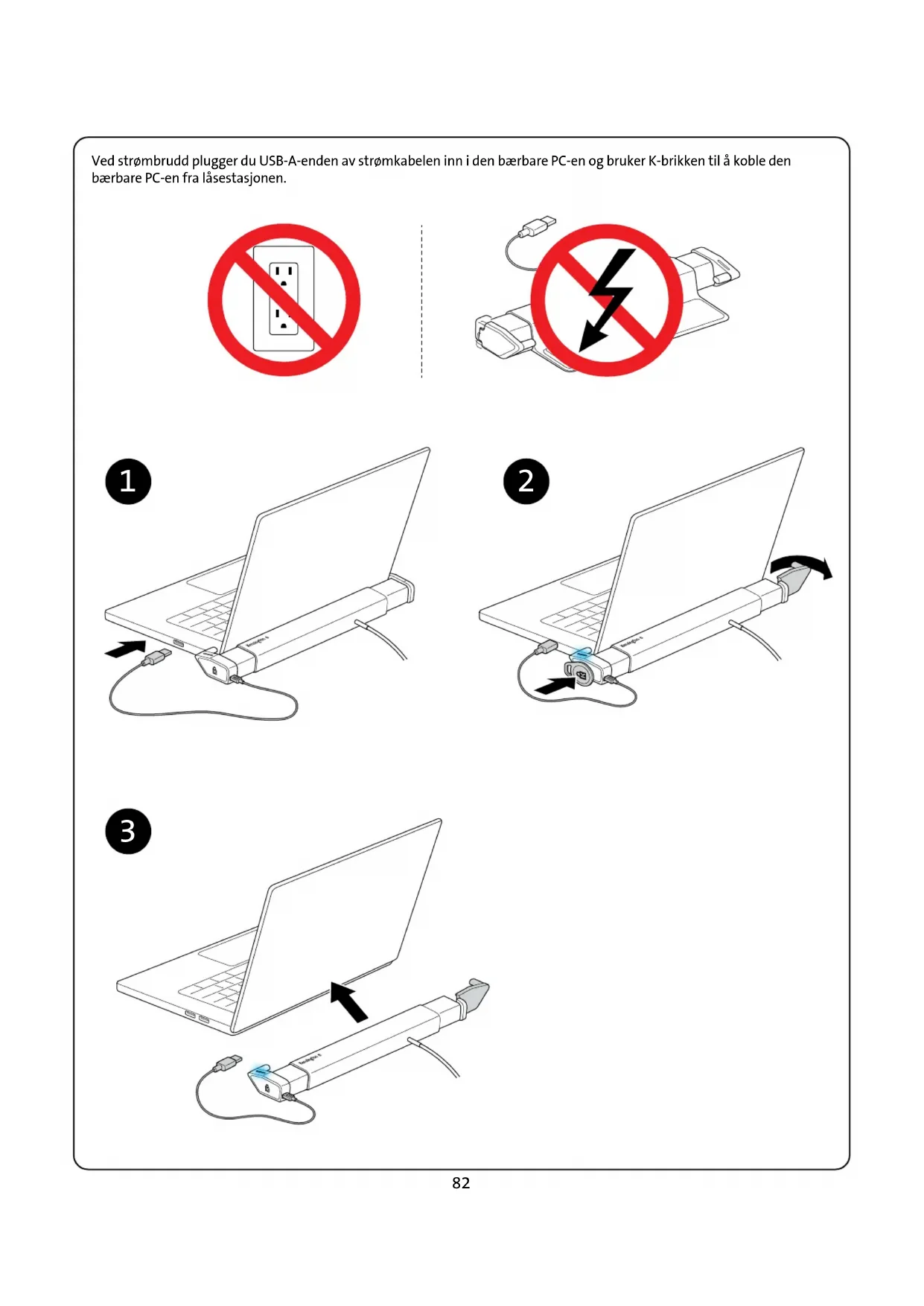 Ved strømbrudd plugger du USB-A-enden av strømkabelen inn i den bærbare PC-en og bruker K-brikken til Å koble den bærbare PC-en fra låsestasjonen.