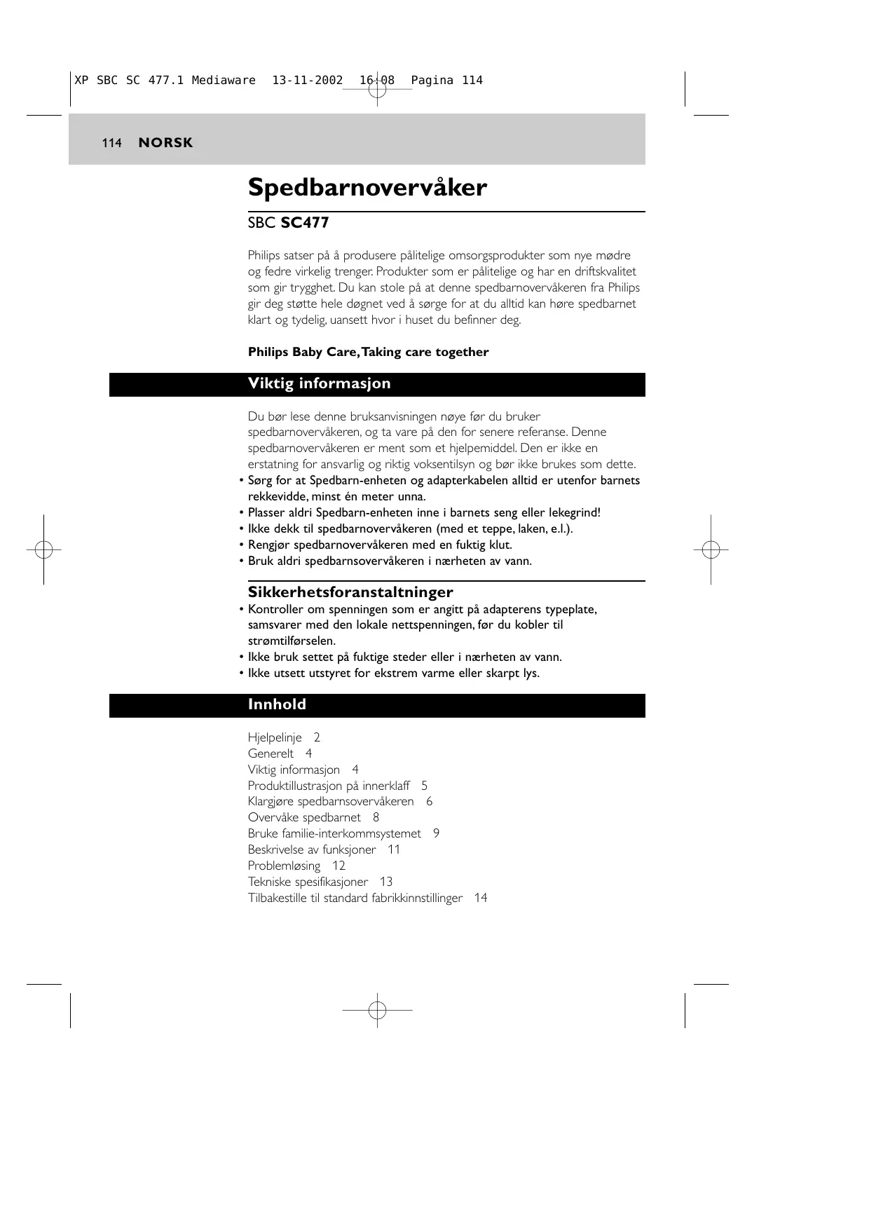 13-11-2002 16:08 Pagina 114 NORSK Spedbarnovervåker SBC SC477 Philips satser på å produsere pålitelige omsorgsprodukter som nye mødre og fedre virkelig trenger. Produkter som er pålitelige og har en driftskvalitet som gir trygghet. Du kan stole på at denne spedbarnovervåkeren fra Philips gir deg støtte hele døgnet ved å sørge for at du alltid kan høre spedbarnet klart og tydelig, uansett hvor i huset du befinner deg. Philips Baby Care,Taking care together Viktig informasjon