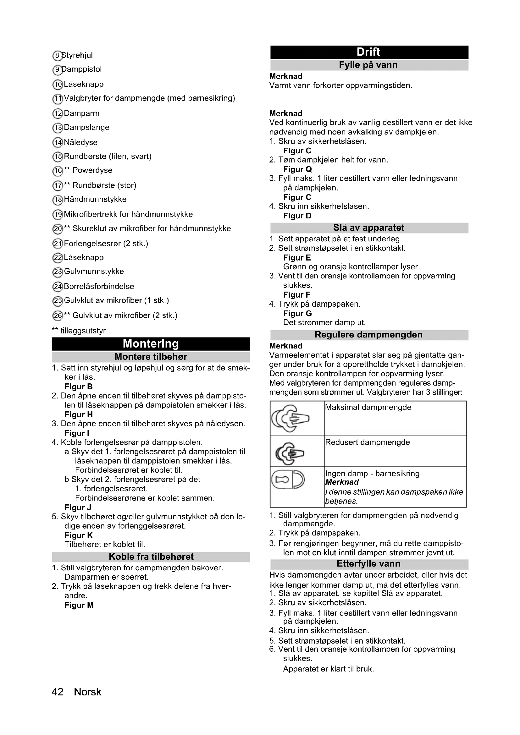 pes og overflatene tørkes med denne. Glassrengjøring OBS Glass-sprekker og skadet overflate Damp kan skade forseglede steder på vindusrammen og føre til spenning i overflaten på vindusruten når det er lave temperaturer ute. Det kan føre til at glasset sprekker. Ikke rett dampen mot forseglede steder på vindusram- men. Varm opp vindusruten når temperaturen ute er lav ved å dampe hele glassflaten lett. Rengjør vindusflaten med håndmunnstykket og overtrekket. For å trekke vannet av, bruk en vindus- nal eller tørk flatene tørre. Bruk af tilbehør Damppistol Damppistolen kan brukes for følgende bruksområder uten tilbehør: Fjerning av lette krøller eller bretter fra hengende klesplagg: Damp klesplagget fra 10-20 cm avstand. For våt støvtørking: Damp en klut raskt og tørk over møblene med den. Nåledyse Nåledysen er egnet for rengjøring av steder som det er vanskelig å komme til, fuger, armaturer, avløp, vasker, toaletter, sjalusier eller varmeapparater. Jo nærmere nåledysen er til det skitne stedet, desto større blir ren- gjøringseffekten, siden temperaturen og dampmengden er høyest ved dyseutløpet. Kraftige kalkavleiringer kan behandles med et egnet rengjøringsmiddel før dam- prengjøringen. La rengjøringsmiddelet virke i ca. 5 mi- nutter og damprengjør deretter.