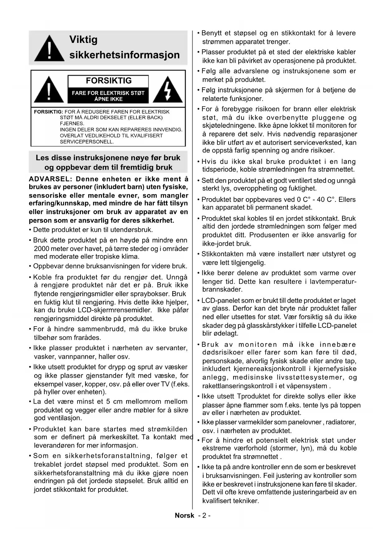 - Husk at barn kan bli opphisset mens de ser på et program, særlig på en "gigantisk" monitor. Sørg for at du plasserer eller installere monitoren der den ikke kan skyves, trekkes eller slås ned.Norsk - 4 - Forutsigbart misbruk og feilbruk