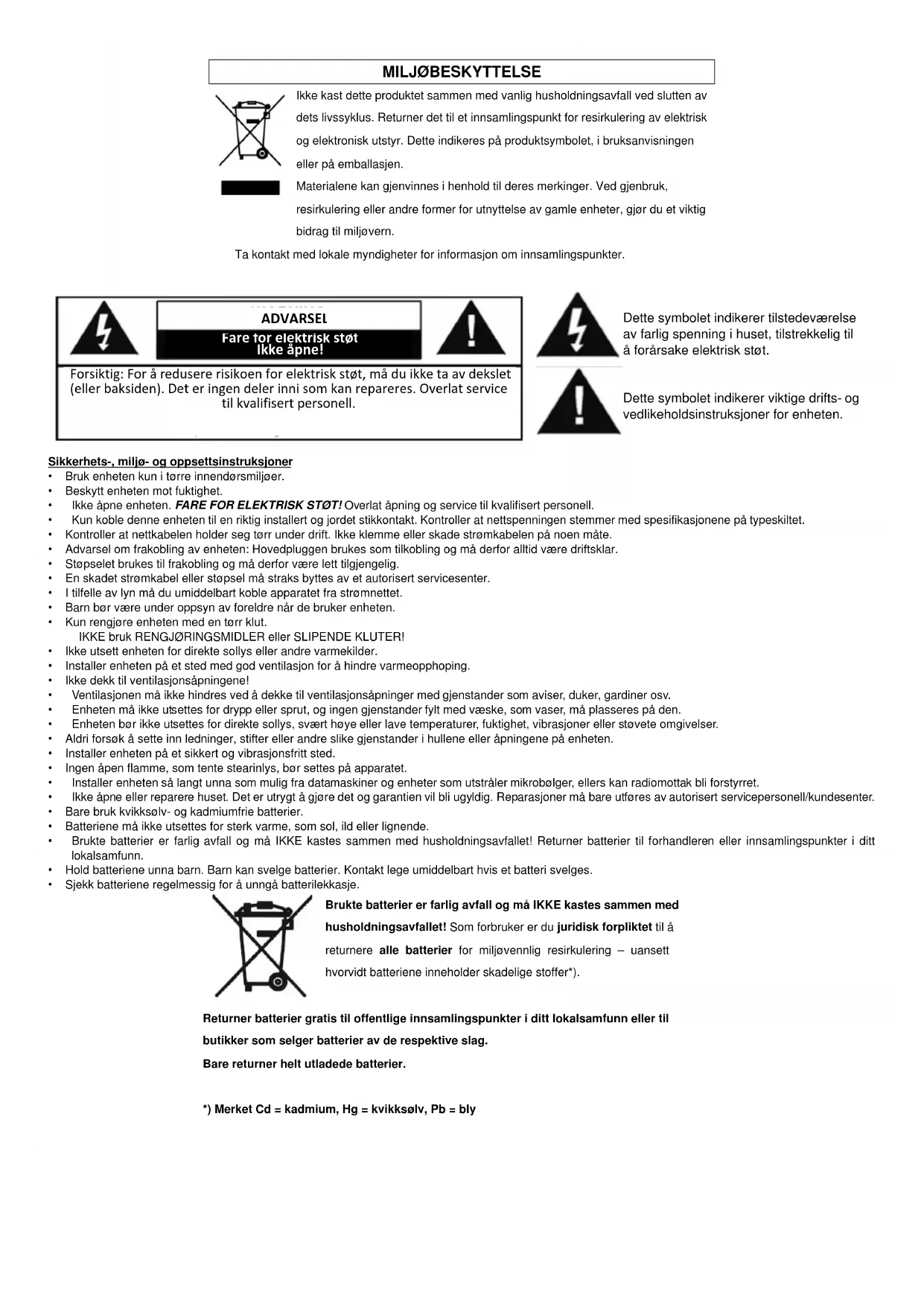 - Brukte batterier er farlig avfall og mA IKKE kastes sammen med husholdningsavfallet! Returner batterier til forhandleren ell innsamlingspunktter i ditt lokalsamfunn.