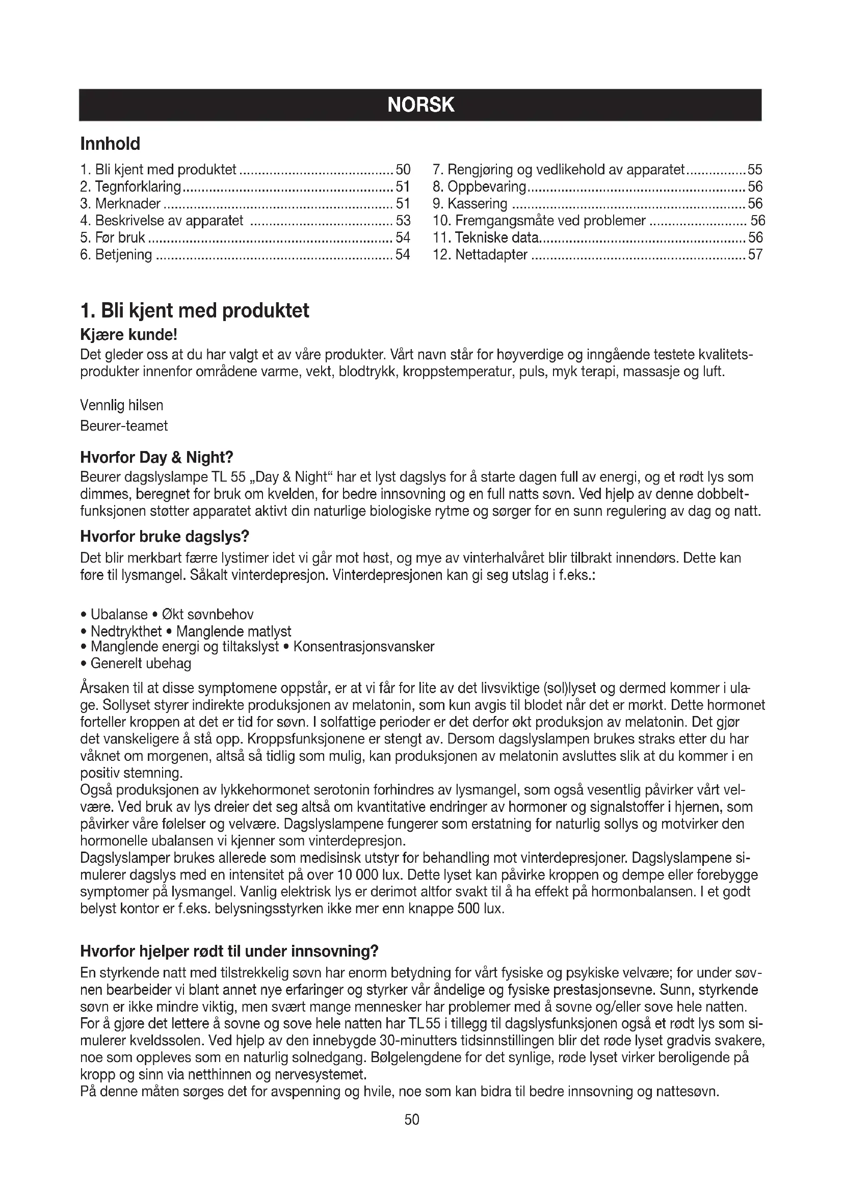 Kjære kunde! Det gleder oss at du har valgt et av våre produkter. Vårt navn står for høyverdige og inngående testete kvalitets- produkter innenfor områdene varme, vekt, blodtrykk, kroppstemperatur, puls, myk terapi, massasje og luft. Vennlig hilsen Beurer-teamet Hvorfor Day & Night? Beurer dagslyslampe TL 55 „Day & Night“ har et lyst dagslys for å starte dagen full av energi, og et rødt lys som dimmes, beregnet for bruk om kvelden, for bedre innsovning og en full natts søvn. Ved hjelp av denne dobbelt- funksjonen støtter apparatet aktivt din naturlige biologiske rytme og sørger for en sunn regulering av dag og natt. Hvorfor bruke dagslys? Det blir merkbart færre lystimer idet vi går mot høst, og mye av vinterhalvåret blir tilbrakt innendørs. Dette kan føre til lysmangel. Såkalt vinterdepresjon. Vinterdepresjonen kan gi seg utslag i f.eks.: