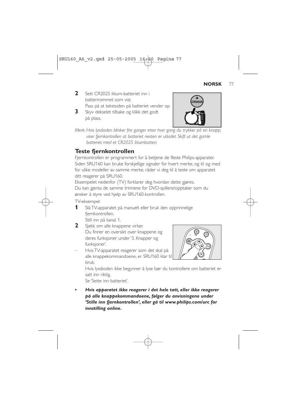 Fjernkontrollen er programmert for Å betjene de fleste Philips-apparater. Siden SRU160 kan bruke forskjellige signaler for hvert merke, og til og med for unlike modeller av samme merke, råder vi deg til Å teste om apparatet ditt reagerer på SRU160.