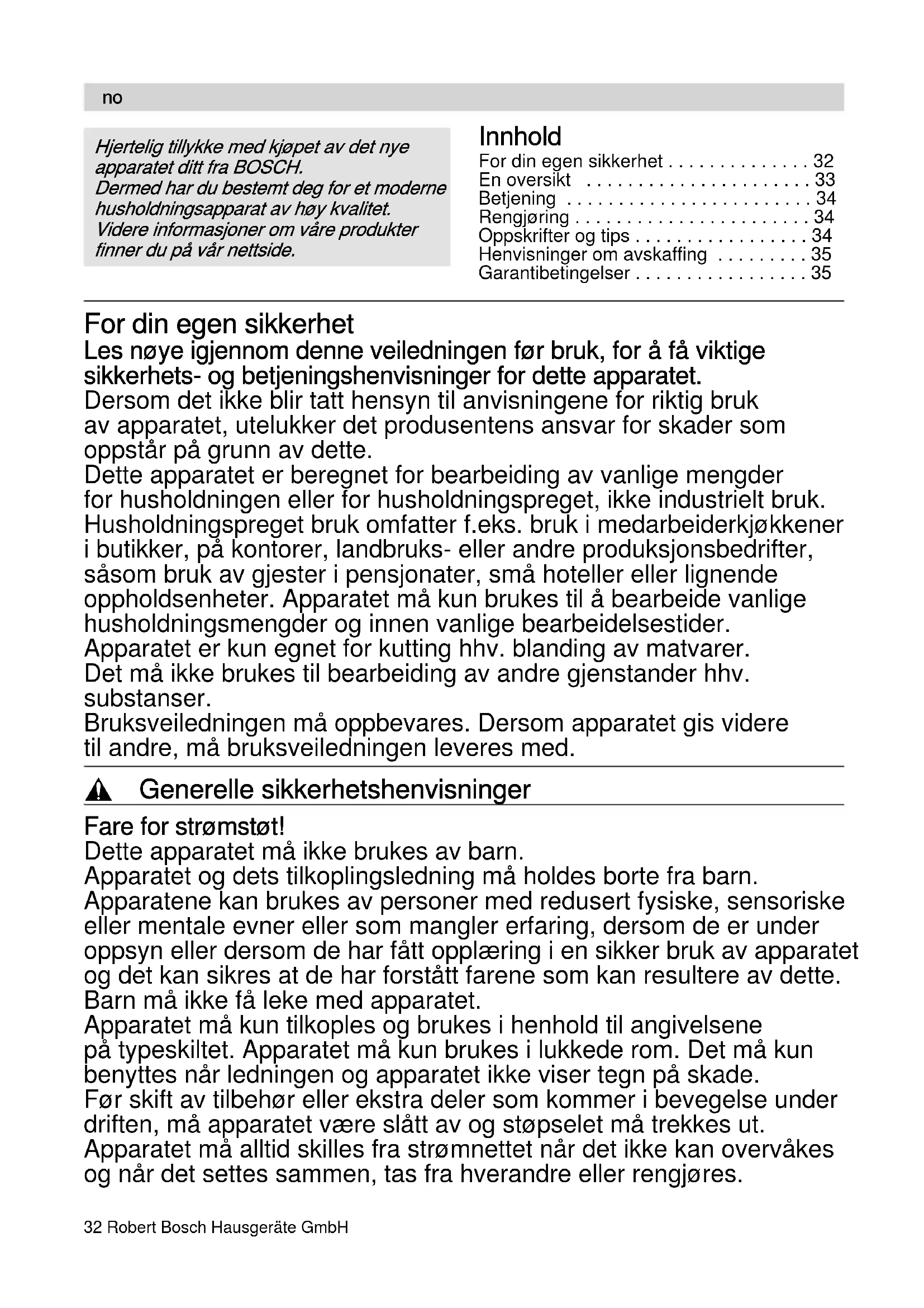 - Garantibetingelser For din egen sikkerhet Les nøye igjennom denne veiledningen før bruk, for å få viktige sikkerhets- og betjeningshenvisninger for dette apparatet. Dersom det ikke blir tatt hensyn til anvisningene for riktig bruk av apparatet, utelukker det produsentens ansvar for skader som oppstår på grunn av dette. Dette apparatet er beregnet for bearbeiding av vanlige mengder for husholdningen eller for husholdningspreget, ikke industrielt bruk. Husholdningspreget bruk omfatter f.eks. bruk i medarbeiderkjøkkener i butikker, på kontorer, landbruks- eller andre produksjonsbedrifter, såsom bruk av gjester i pensjonater, små hoteller eller lignende oppholdsenheter. Apparatet må kun brukes til å bearbeide vanlige husholdningsmengder og innen vanlige bearbeidelsestider. Apparatet er kun egnet for kutting hhv. blanding av matvarer. Det må ikke brukes til bearbeiding av andre gjenstander hhv. substanser. Bruksveiledningen må oppbevares. Dersom apparatet gis videre til andre, må bruksveiledningen leveres med. , Generelle sikkerhetshenvisninger Fare for strømstøt! Dette apparatet må ikke brukes av barn. Apparatet og dets tilkoplingsledning må holdes borte fra barn. Apparatene kan brukes av personer med redusert fysiske, sensoriske eller mentale evner eller som mangler erfaring, dersom de er under oppsyn eller dersom de har fått opplæring i en sikker bruk av apparatet og det kan sikres at de har forstått farene som kan resultere av dette. Barn må ikke få leke med apparatet. Apparatet må kun tilkoples og brukes i henhold til angivelsene på typeskiltet. Apparatet må kun brukes i lukkede rom. Det må kun benyttes når ledningen og apparatet ikke viser tegn på skade. Før skift av tilbehør eller ekstra deler som kommer i bevegelse under driften, må apparatet være slått av og støpselet må trekkes ut. Apparatet må alltid skilles fra strømnettet når det ikke kan overvåkes og når det settes sammen, tas fra hverandre eller rengjøres. p. 35