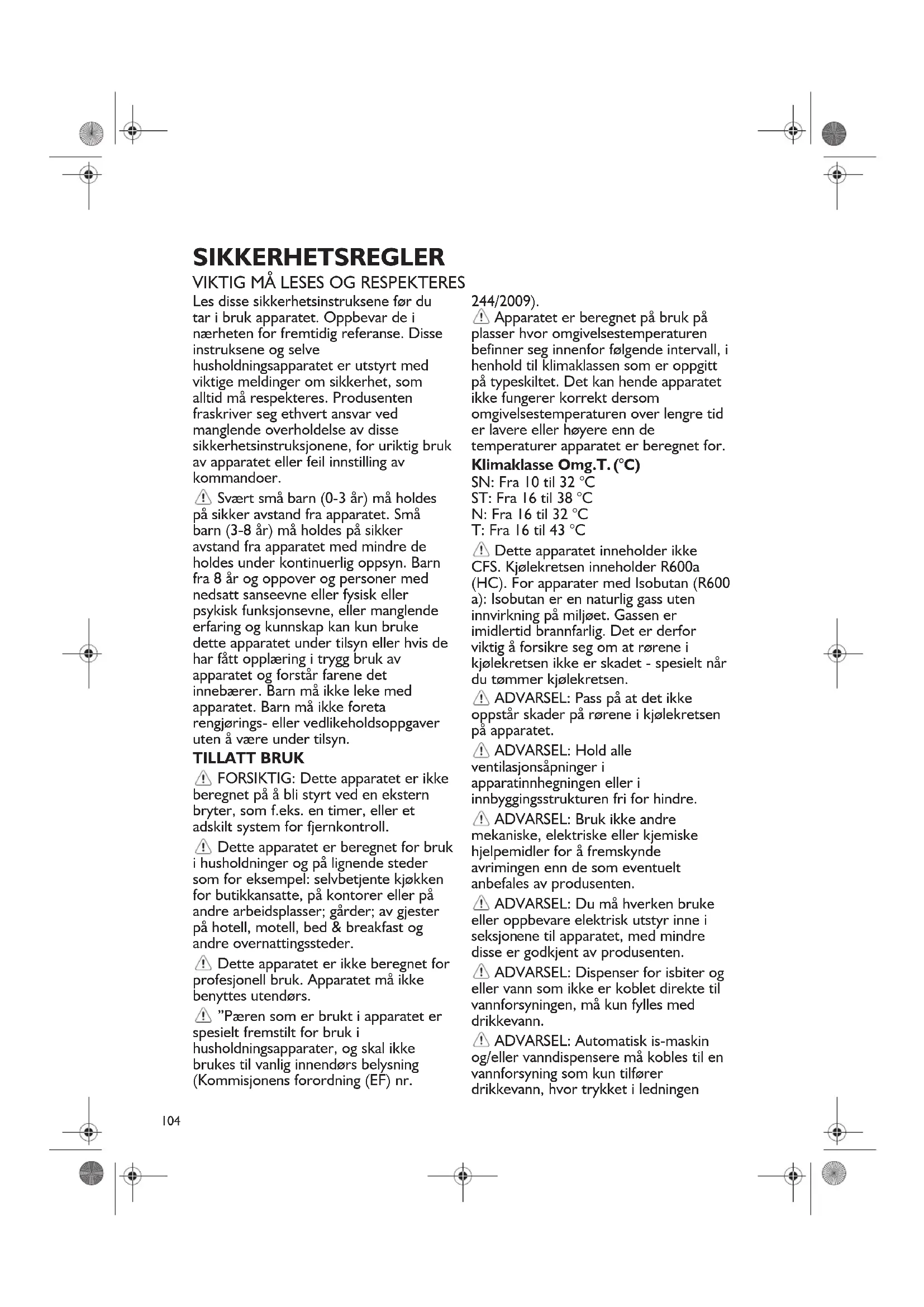 Les disse sikkerhetsinstruksene før du tar i bruk apparatet. Oppbevar de i nærheten for fremtidig referanse. Disse instruksene og selve husholdningsapparatet er utstyrt med viktige meldinger om sikkerhet, som alltid må respekteres. Produsenten fraskriver seg ethvert ansvar ved manglende overholdelse av disse sikkerhetsinstruksjonene, for uriktig bruk av apparatet eller feil innstilling av kommandoer. Svært små barn (0-3 år) må holdes på sikker avstand fra apparatet. Små barn (3-8 år) må holdes på sikker avstand fra apparatet med mindre de holdes under kontinuerlig oppsyn. Barn fra 8 år og oppover og personer med nedsatt sanseevne eller fysisk eller psykisk funksjonsevne, eller manglende erfaring og kunnskap kan kun bruke dette apparatet under tilsyn eller hvis de har fått opplæring i trygg bruk av apparatet og forstår farene det innebærer. Barn må ikke leke med apparatet. Barn må ikke foreta rengjørings- eller vedlikeholdsoppgaver uten å være under tilsyn. TILLATT BRUK FORSIKTIG: Dette apparatet er ikke beregnet på å bli styrt ved en ekstern bryter, som f.eks. en timer, eller et adskilt system for fjernkontroll. Dette apparatet er beregnet for bruk i husholdninger og på lignende steder som for eksempel: selvbetjente kjøkken for butikkansatte, på kontorer eller på andre arbeidsplasser; gårder; av gjester på hotell, motell, bed & breakfast og andre overnattingssteder. Dette apparatet er ikke beregnet for profesjonell bruk. Apparatet må ikke benyttes utendørs. ”Pæren som er brukt i apparatet er spesielt fremstilt for bruk i husholdningsapparater, og skal ikke brukes til vanlig innendørs belysning (Kommisjonens forordning (EF) nr. 244/2009). Apparatet er beregnet på bruk på plasser hvor omgivelsestemperaturen befinner seg innenfor følgende intervall, i henhold til klimaklassen som er oppgitt på typeskiltet. Det kan hende apparatet ikke fungerer korrekt dersom omgivelsestemperaturen over lengre tid er lavere eller høyere enn de temperaturer apparatet er beregnet for. Klimaklasse Omg.T. (°C) SN: Fra 10 til 32 °C ST: Fra 16 til 38 °C N: Fra 16 til 32 °C T: Fra 16 til 43 °C Dette apparatet inneholder ikke CFS. Kjølekretsen inneholder R600a (HC). For apparater med Isobutan (R600 a): Isobutan er en naturlig gass uten innvirkning på miljøet. Gassen er imidlertid brannfarlig. Det er derfor viktig å forsikre seg om at rørene i kjølekretsen ikke er skadet - spesielt når du tømmer kjølekretsen. ADVARSE L: Pass på at det ikke oppstår skader på rørene i kjølekretsen på apparatet. ADVARSEL: Hold alle ventilasjonsåpninger i apparatinnhegningen eller i innbyggingsstrukturen fri for hindre. ADVARSEL: Bruk ikke andre mekaniske, elektriske eller kjemiske hjelpemidler for å fremskynde avrimingen enn de som eventuelt anbefales av produsenten. ADVARSEL: Du må hverken bruke eller oppbevare elektrisk utstyr inne i seksjon ene til apparatet, med mindre disse er godkjent av produsenten. ADVARSEL: Dispenser for isbiter og eller vann som ikke er koblet direkte til vannforsyningen, må kun fylles med drikkevann. ADVARSEL: Automatisk is-maskin og/eller vanndispensere må kobles til en vannforsyning som kun tilfører drikkevann, hvor trykket i ledningen105