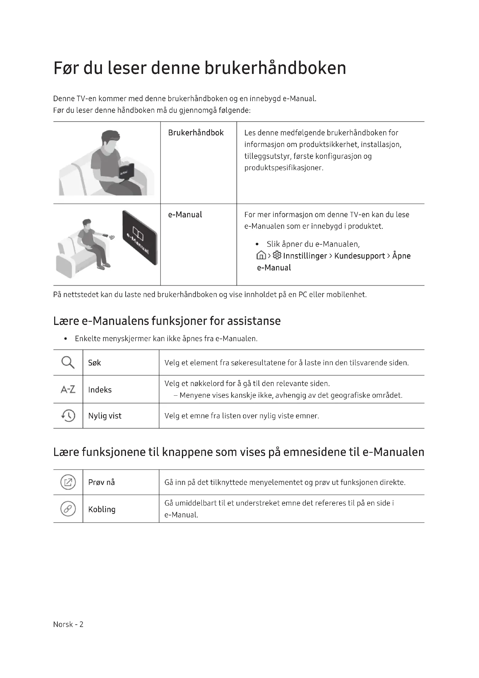 - Slik åpner du e-Manualen, > Innstillinger > Kundesupport > Åpne e-Manual På nettstedet kan du laste ned brukerhåndboken og vise innholdet på en PC eller mobilenhet. Lære e-Manualens funksjoner for assistanse