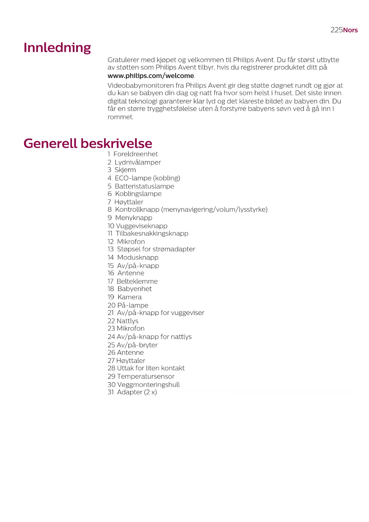 Vær oppmerksom på at du brukerijke babymonitoren på eget ansvar. Koninklijke Philips N.V. og tilhorende selskaper er ikke ansvarlig for funksjonen til ellerBruken av的各项babymonitoren, og patar seg derfor intet ansvar i forbindelse med dinBruk av��ne.