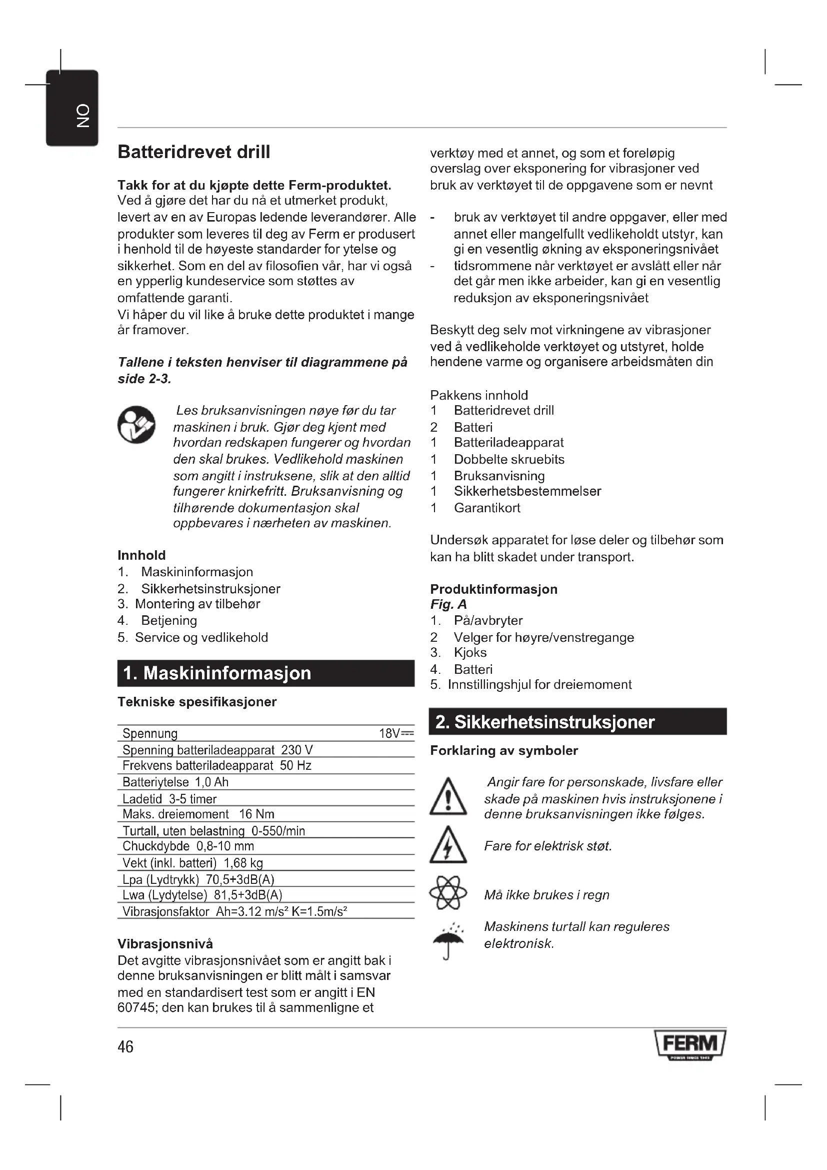 Batteridrevet drill Takk for at du kjøpte dette Ferm-produktet. Ved å gjøre det har du nå et utmerket produkt, levert av en av Europas ledende leverandører. Alle produkter som leveres til deg av Ferm er produsert i henhold til de høyeste standarder for ytelse og sikkerhet. Som en del av filosofien vår, har vi også en ypperlig kundeservice som støttes av omfattende garanti. Vi håper du vil like å bruke dette produktet i mange år framover. Tallene i teksten henviser til diagrammene på side 2-3. Les bruksanvisningen nøye før du tar maskinen i bruk. Gjør deg kjent med hvordan redskapen fungerer og hvordan den skal brukes. Vedlikehold maskinen som angitt i instruksene, slik at den alltid fungerer knirkefritt. Bruksanvisning og tilhørende dokumentasjon skal oppbevares i nærheten av maskinen. Innhold