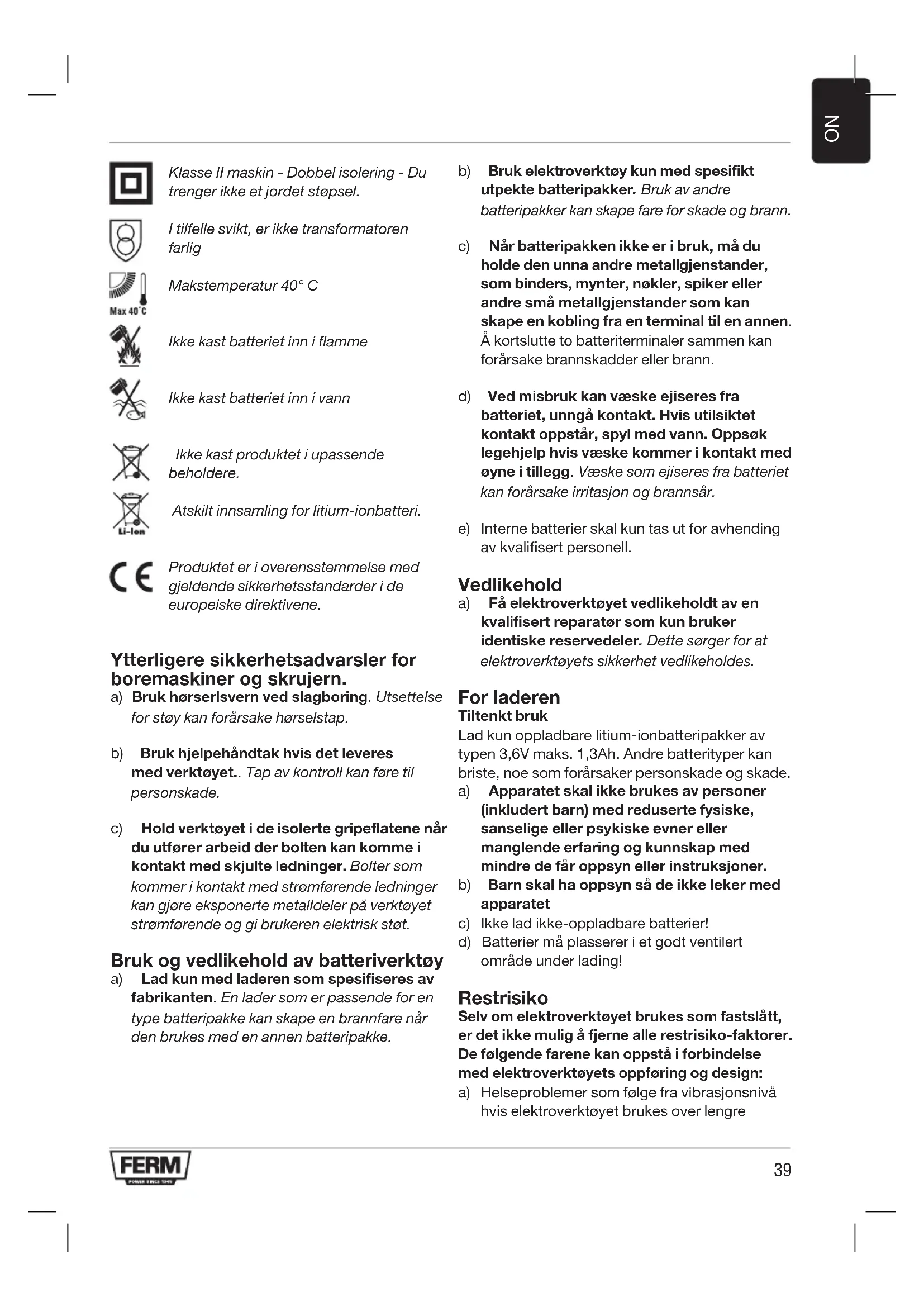Klasse II maskin - Dobbel isolering - Du trenger ikke et jordet støpsel. I tilfelle svikt, er ikke transformatoren farlig Makstemperatur 40° C Ikke kast batteriet inn i flamme Ikke kast batteriet inn i vann Ikke kast produktet i upassende beholdere. Atskilt innsamling for litium-ionbatteri. Produktet er i overensstemmelse med gjeldende sikkerhetsstandarder i de europeiske direktivene. Ytterligere sikkerhetsadvarsler for boremaskiner og skrujern. a) Bruk hørserlsvern ved slagboring. Utsettelse for støy kan forårsake hørselstap. b) Bruk hjelpehåndtak hvis det leveres med verktøyet.. Tap av kontroll kan føre til personskade. c) Hold verktøyet i de isolerte gripeflatene når du utfører arbeid der bolten kan komme i kontakt med skjulte ledninger. Bolter som kommer i kontakt med strømførende ledninger kan gjøre eksponerte metalldeler på verktøyet strømførende og gi brukeren elektrisk støt. Bruk og vedlikehold av batteriverktøy a) Lad kun med laderen som spesifiseres av fabrikanten. En lader som er passende for en type batteripakke kan skape en brannfare når den brukes med en annen batteripakke. b) Bruk elektroverktøy kun med spesifikt utpekte batteripakker. Bruk av andre batteripakker kan skape fare for skade og brann. c) Når batteripakken ikke er i bruk, må du holde den unna andre metallgjenstander, som binders, mynter, nøkler, spiker eller andre små metallgjenstander som kan skape en kobling fra en terminal til en annen. Å kortslutte to batteriterminaler sammen kan forårsake brannskadder eller brann. d) Ved misbruk kan væske ejiseres fra batteriet, unngå kontakt. Hvis utilsiktet kontakt oppstår, spyl med vann. Oppsøk legehjelp hvis væske kommer i kontakt med øyne i tillegg. Væske som ejiseres fra batteriet kan forårsake irritasjon og brannsår. e) Interne batterier skal kun tas ut for avhending av kvalifisert personell. Vedlikehold a) Få elektroverktøyet vedlikeholdt av en kvalifisert reparatør som kun bruker identiske reservedeler. Dette sørger for at elektroverktøyets sikkerhet vedlikeholdes. For laderen Tiltenkt bruk Lad kun oppladbare litium-ionbatteripakker av typen 3,6V maks. 1,3Ah. Andre batterityper kan briste, noe som forårsaker personskade og skade. a) Apparatet skal ikke brukes av personer (inkludert barn) med reduserte fysiske, sanselige eller psykiske evner eller manglende erfaring og kunnskap med mindre de får oppsyn eller instruksjoner. b) Barn skal ha oppsyn så de ikke leker med apparatet c) Ikke lad ikke-oppladbare batterier! d) Batterier må plasserer i et godt ventilert område under lading! Restrisiko Selv om elektroverktøyet brukes som fastslått, er det ikke mulig å fjerne alle restrisiko-faktorer. De følgende farene kan oppstå i forbindelse med elektroverktøyets oppføring og design: a) Helseproblemer som følge fra vibrasjonsnivå hvis elektroverktøyet brukes over lengre40