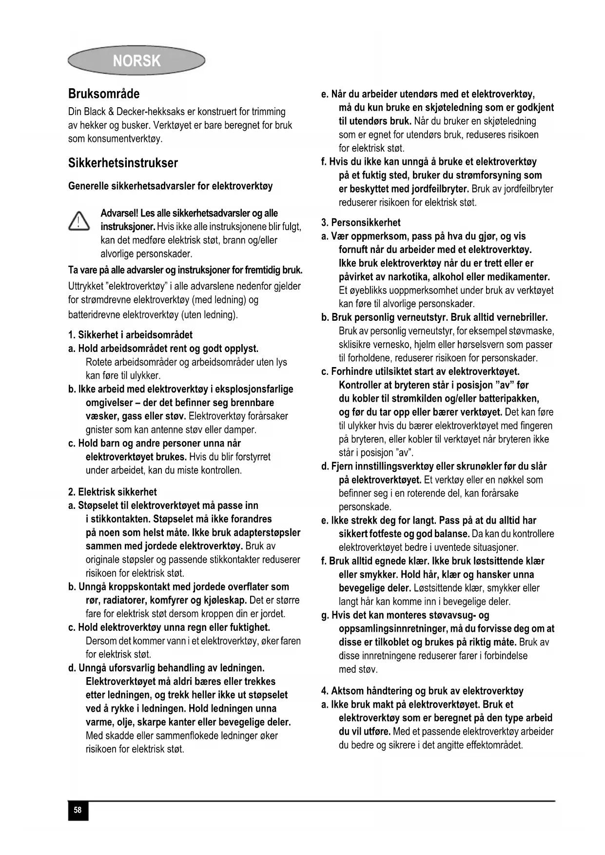 Garanti Black & Decker er trygg på kvaliteten til sine produkter og tilbyr en enestående garanti. Denne garantierklæringen kommer i tillegg til dine lovbestemte rettigheter, og er ikke i konflikt med disse. Garantien er gyldig i EU- og EFTA-medlemsstatene. Hvis et Black & Decker-produkt går i stykker på grunn av material- og/eller fabrikasjonsfeil eller har mangler i forhold til spesifikasjonene, innen 24 måneder fra kjøpet, påtar Black & Decker seg å skifte ut defekte deler, reparere produkter som har vært utsatt for alminnelig slitasje, eller bytte ut slike produkter med minst mulig vanskelighet for kunden, med mindre: Produktet har vært brukt i yrkes-/næringsvirksomhet eller til utleie. Produktet har vært utsatt for feilaktig bruk eller mislighold. Produktet har blitt skadet av fremmede gjenstander eller stoffer eller ved et uhell. Reparasjoner er forsøkt utført av andre enn autoriserte serviceverksteder eller Black & Deckers serviceteknikere. For å ta garantien i bruk skal produktet og kjøpekvittering leveres til forhandleren eller til et autorisert serviceverksted. For informasjon om nærmeste autoriserte serviceverksted, kontakt ditt lokale Black & Decker-kontor på den adressen som er angitt i bruksanvisningen. En oversikt over autoriserte serviceverksteder og opplysninger om ettersalgsservice og kontakter er også tilgjengelig på Internett: www.2helpU.com. Besøk vårt webområde www.blackanddecker.no for å registrere ditt nye Black & Decker-produkt og for å holde deg oppdatert om nye produkter og spesialtilbud. Du finner mer informasjon om Black & Decker og produktutvalget vårt på www.blackanddecker.no.64 DANSK Dansk Anvendelsesområde Din Black & Decker hækklipper er designet til at klippe hække og buske. Værktøjet er kun beregnet til privat brug. Sikkerhedsvejledninger Generelle sikkerhedsadvarsler for elværktøj Advarsel! Læs alle sikkerhedsadvarsler og instruktioner. Hvis ikke alle instruktioner følges, kan der opstå risiko for elektrisk stød, brand og/eller alvorlige personskader. Gem alle advarsler og instruktioner til senere brug. Begrebet ”elværktøj”, der benyttes i nedenstående advarsler, henviser til netdrevne (med netledning) eller batteridrevne (uden netledning) maskiner.