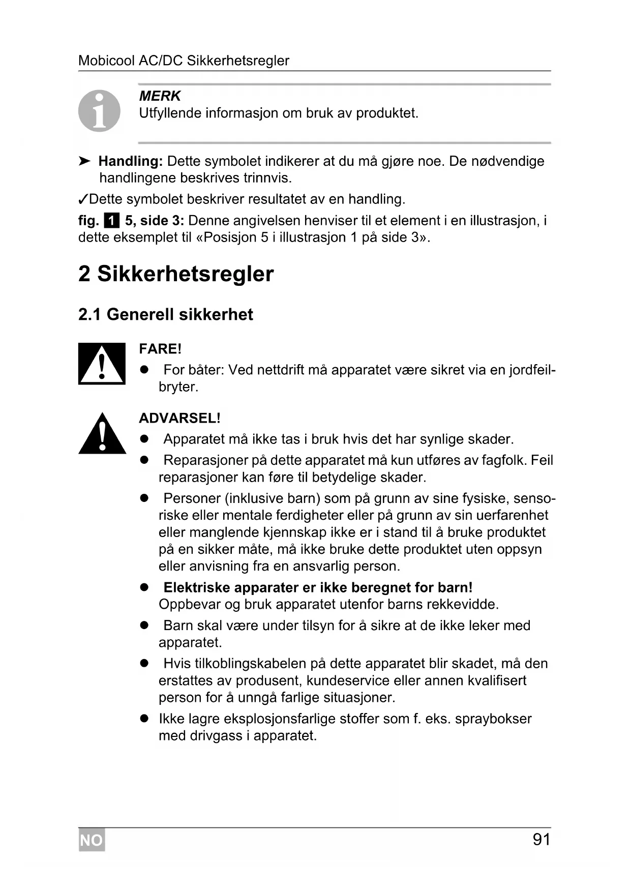 ADVARSEL! Apparatet må ikke tas i bruk hvis det har synlige skader. Reparasjoner på dette apparatet må kun utføres av fagfolk. Feil reparasjoner kan føre til betydelige skader. Personer (inklusive barn) som på grunn av sine fysiske, senso- riske eller mentale ferdigheter eller på grunn av sin uerfarenhet eller manglende kjennskap ikke er i stand til å bruke produktet på en sikker måte, må ikke bruke dette produktet uten oppsyn eller anvisning fra en ansvarlig person. Elektriske apparater er ikke beregnet for barn! Oppbevar og bruk apparatet utenfor barns rekkevidde. Barn skal være under tilsyn for å sikre at de ikke leker med apparatet. Hvis tilkoblingskabelen på dette apparatet blir skadet, må den erstattes av produsent, kundeservice eller annen kvalifisert person for å unngå farlige situasjoner. Ikke lagre eksplosjonsfarlige stoffer som f. eks. spraybokser med drivgass i apparatet.NO Sikkerhetsregler Mobicool AC/DC