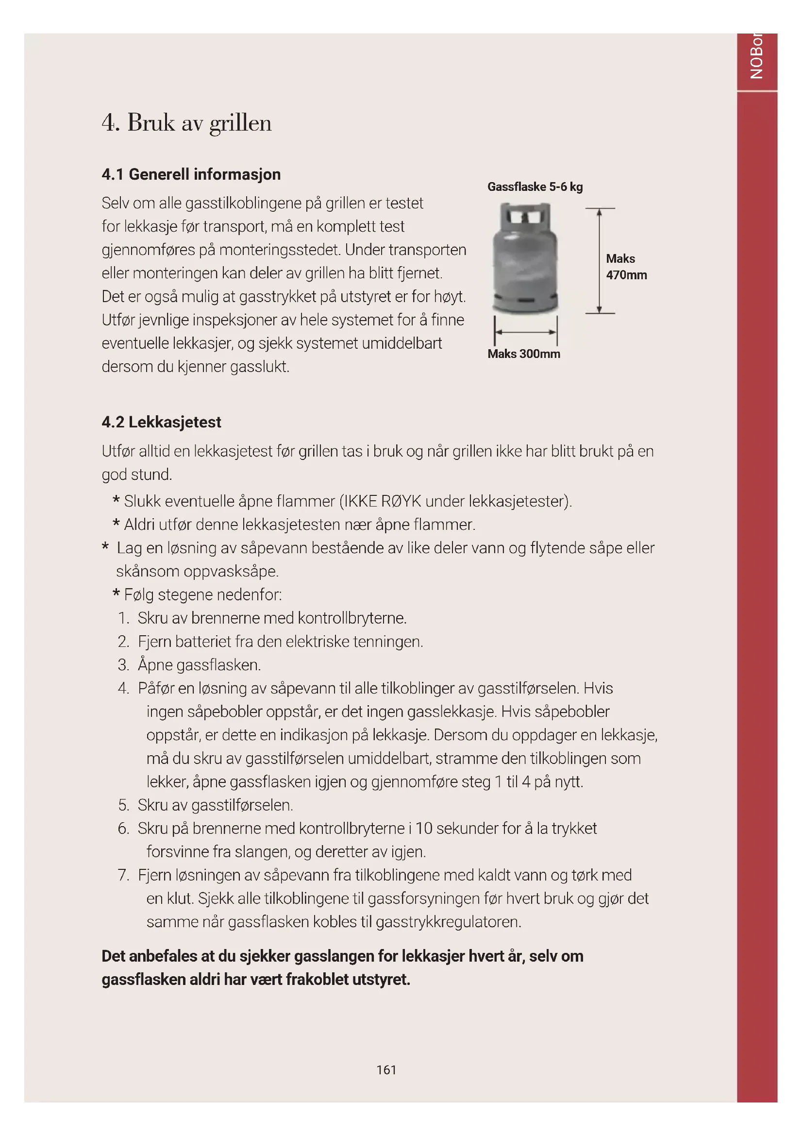 en klut. Sjekk alle tilkoblingene til gassforsyningen før hvert bruk og gjør det samme når gassflasken kobles til gasstrykkregulatoren. Det anbefales at du sjekker gasslangen for lekkasjer hvert år, selv om gassflasken aldri har vært frakoblet utstyret. Gassflaske 5-6 kg Maks 300mm Maks 470mm162 NOBoretti Maggiore An / Brukermanual - Installasionsräd Merk: Sørg for at du tester alle løse tilkoblinger (inkludert sidebrennere) og, hvis påkrevd, strammer dem igjen når du tester utstyret for lekkasjer. Merk: Nå om dagen er de fleste gassflasker utstyrt med en mekanisme som oppdager lekkasjer inne i beholderen. Når gassen slippes for fort, vil denne mekanismen kutte gasstilførselen. En lekkasje begrenser gasstilførselen slik at det kan være vanskelig å tenne opp grillen. Merk: Slå av gasstilførselen og kontakt forhandleren hvis du ikke klarer å stenge en gasslekkasje. Selv en liten lekkasje kan lage en brann. Merk: Ta kontakt med forhandleren din hvis du etter flere forsøk ikke klarer å tenne opp grillen. Merk: Sørg for at kontrollbryterne er i posisjon "OFF" (AV) når du ikke bruker utstyret.