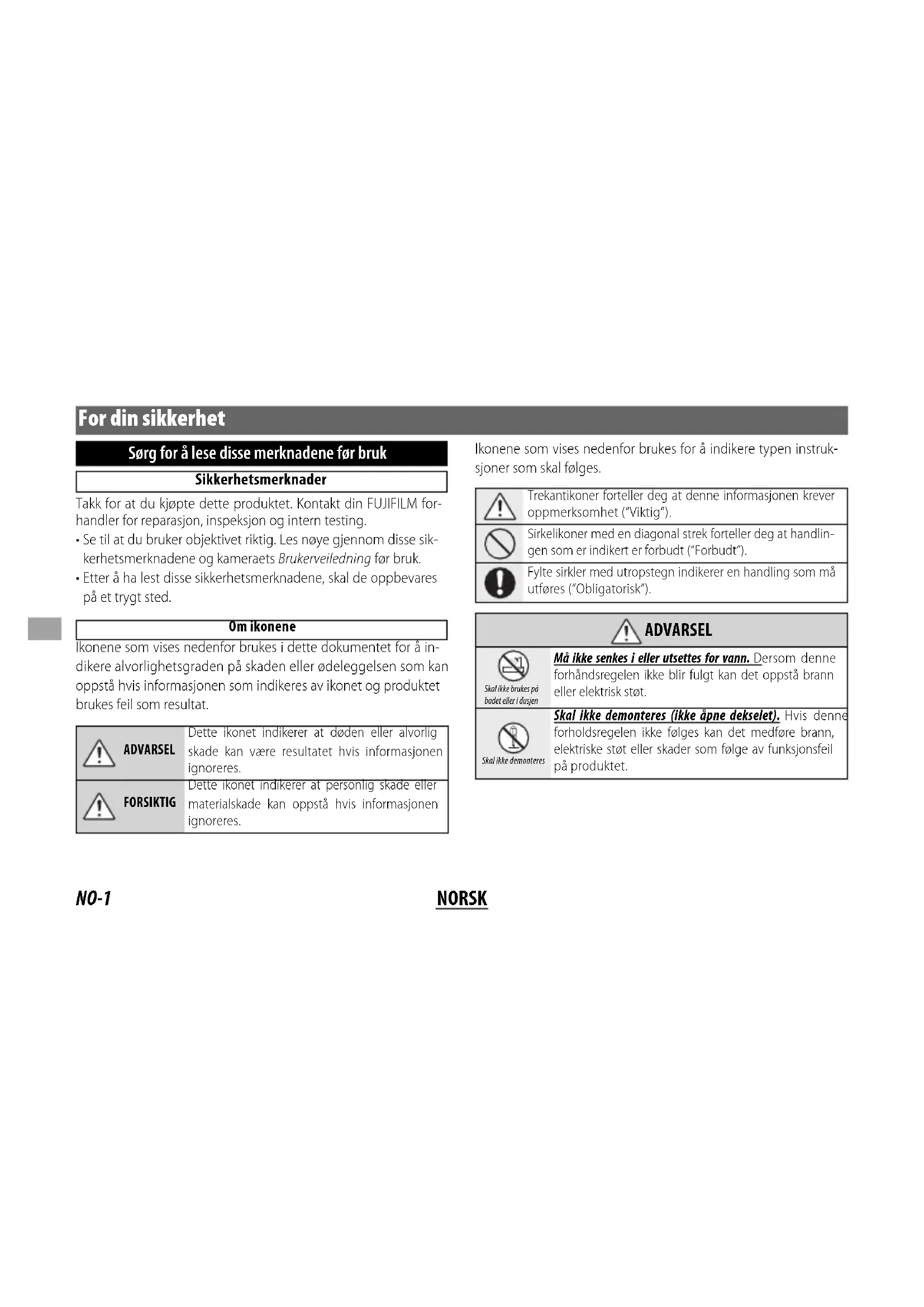 - Etter å ha lest disse sikkerhetsmerknadene, skal de oppbevares på et trygt sted. Om ikonene Ikonene som vises nedenfor brukes i dette dokumentet for å in- dikere alvorlighetsgraden på skaden eller ødeleggelsen som kan oppstå hvis informasjonen som indikeres av ikonet og produktet brukes feil som resultat. ADVARSELDette ikonet indikerer at døden eller alvorlig skade kan være resultatet hvis informasjonen ignoreres.FORSIKTIGDette ikonet indikerer at personlig skade eller materialskade kan oppstå hvis informasjonen ignoreres. Ikonene som vises nedenfor brukes for å indikere typen instruk- sjoner som skal følges. Trekantikoner forteller deg at denne informasjonen krever oppmerksomhet (“Viktig”).Sirkelikoner med en diagonal strek forteller deg at handlin-gen som er indikert er forbudt (“Forbudt”).Fylte sirkler med utropstegn indikerer en handling som må utføres (“Obligatorisk”).