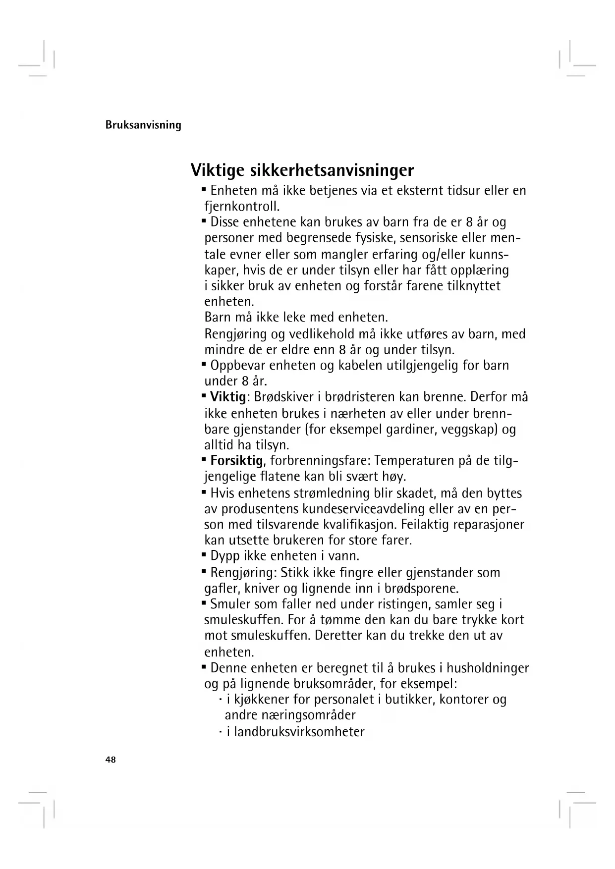 - Ikke bruk brødristeren uten innskjøvet smulebrett.