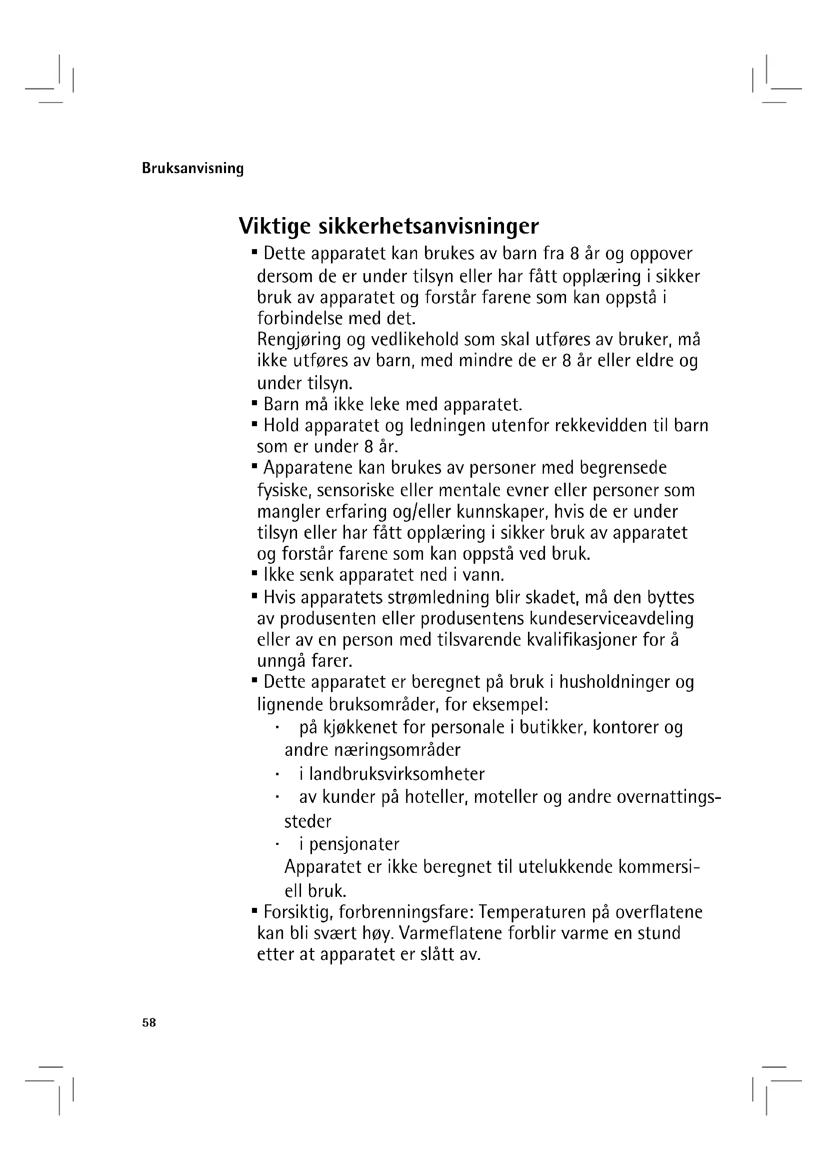 - Forsiktig, forbrenningsfare: Temperaturen på overatene kan bli svært høy. Varmeatene forblir varme en stund etter at apparatet er slått av. Bruksanvisning59