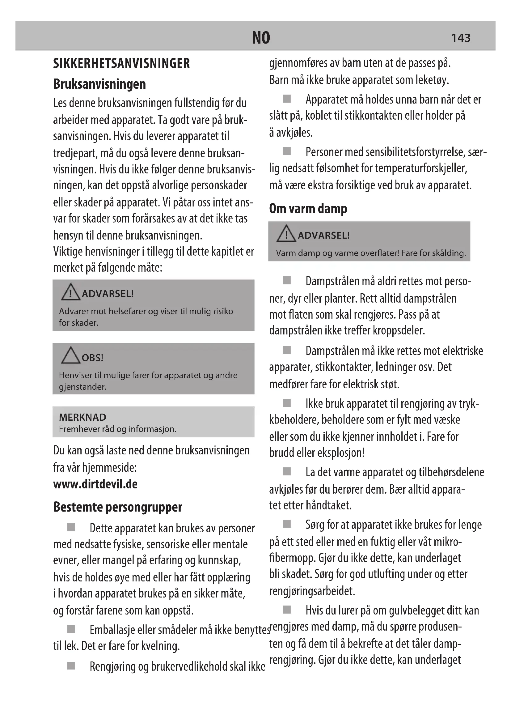 142SIKKERHETSANVISNINGER Bruksanvisningen Les denne bruksanvisningen fullstendig før du arbeider med apparatet. Ta godt vare på bruk- sanvisningen. Hvis du leverer apparatet til tredjepart, må du også levere denne bruksan- visningen. Hvis du ikke følger denne bruksanvis- ningen, kan det oppstå alvorlige personskader eller skader på apparatet. Vi påtar oss intet ans- var for skader som forårsakes av at det ikke tas hensyn til denne bruksanvisningen. Viktige henvisninger i tillegg til dette kapitlet er merket på følgende måte: ADVARSEL!Advarer mot helsefarer og viser til mulig risiko for skader.OBS!Henviser til mulige farer for apparatet og andre gjenstander.MERKNADFremhever råd og informasjon. Du kan også laste ned denne bruksanvisningen fra vår hjemmeside: www.dirtdevil.de Bestemte persongrupper Dette apparatet kan brukes av personer med nedsatte fysiske, sensoriske eller mentale evner, eller mangel på erfaring og kunnskap, hvis de holdes øye med eller har fått opplæring i hvordan apparatet brukes på en sikker måte, og forstår farene som kan oppstå. Emballasje eller smådeler må ikke benyttes til lek. Det er fare for kvelning. Rengjøring og brukervedlikehold skal ikke gjennomføres av barn uten at de passes på. Barn må ikke bruke apparatet som leketøy. Apparatet må holdes unna barn når det er slått på, koblet til stikkontakten eller holder på å avkjøles. Personer med sensibilitetsforstyrrelse, sær- lig nedsatt følsomhet for temperaturforskjeller, må være ekstra forsiktige ved bruk av apparatet. Om varm damp ADVARSEL!Varm damp og varme overater! Fare for skålding. Dampstrålen må aldri rettes mot perso- ner, dyr eller planter. Rett alltid dampstrålen mot aten som skal rengjøres. Pass på at dampstrålen ikke treer kroppsdeler. Dampstrålen må ikke rettes mot elektriske apparater, stikkontakter, ledninger osv. Det medfører fare for elektrisk støt. Ikke bruk apparatet til rengjøring av tryk- kbeholdere, beholdere som er fylt med væske eller som du ikke kjenner innholdet i. Fare for brudd eller eksplosjon! La det varme apparatet og tilbehørsdelene avkjøles før du berører dem. Bær alltid appara- tet etter håndtaket. Sørg for at apparatet ikke brukes for lenge på ett sted eller med en fuktig eller våt mikro- bermopp. Gjør du ikke dette, kan underlaget bli skadet. Sørg for god utlufting under og etter rengjøringsarbeidet. Hvis du lurer på om gulvbelegget ditt kan rengjøres med damp, må du spørre produsen- ten og få dem til å bekrefte at det tåler damp- rengjøring. Gjør du ikke dette, kan underlaget
