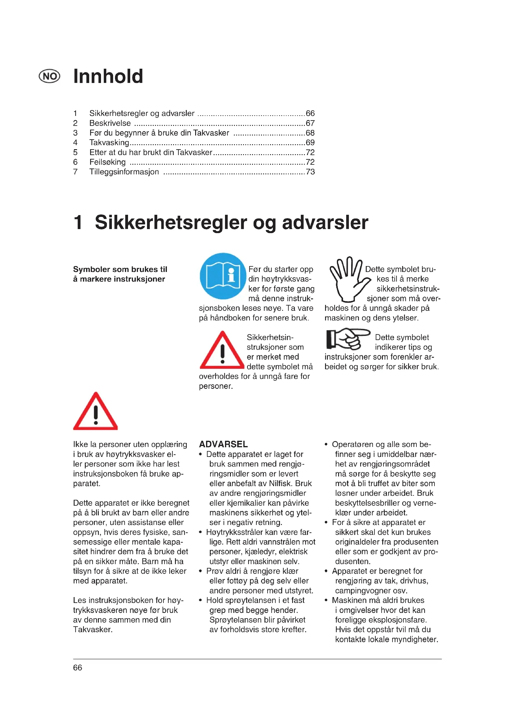 Ikke la personer uten opplæring i bruk av høytrykksvasker el- ler personer som ikke har lest instruksjonsboken få bruke ap- paratet. Dette apparatet er ikke beregnet på å bli brukt av barn eller andre personer, uten assistanse eller oppsyn, hvis deres fysiske, san- semessige eller mentale kapa- sitet hindrer dem fra å bruke det på en sikker måte. Barn må ha tilsyn for å sikre at de ikke leker med apparatet. Les instruksjonsboken for høy- trykksvaskeren nøye før bruk av denne sammen med din Takvasker. ADVARSEL