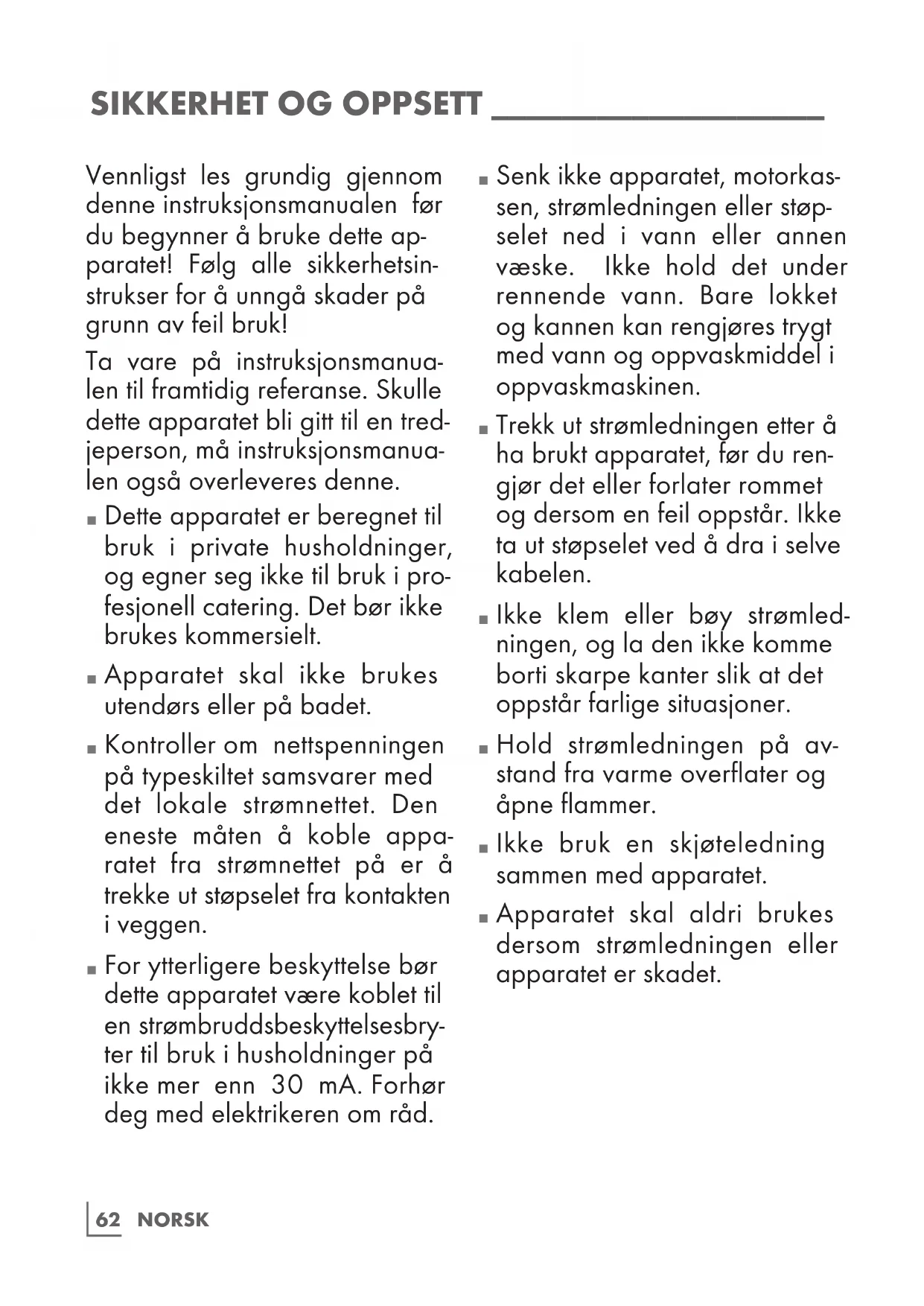 For ytterligere beskyttelse bør dette apparatet være koblet til en strømbruddsbeskyttelsesbry- ter til bruk i husholdninger på ikke mer enn 30 mA. Forhør deg med elektrikeren om råd.