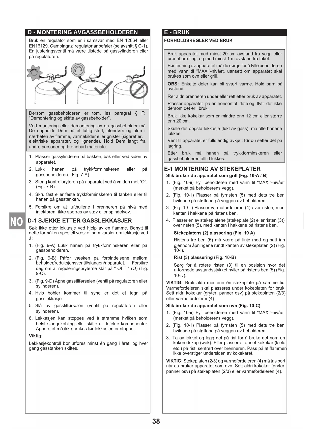 helst slangekobling eller skifte ut defekte komponenter. Apparatet må ikke brukes før lekkasjen er stoppet. Viktig: Lekkasjekontroll bør utføres minst én gang i året, og hver gang gasstanken skiftes. E - BRUk fORhOlDSREGlER VED BRUk Bruk apparatet med minst 20 cm avstand fra vegg eller brennbare ting, og med minst 1 m avstand fra taket. Før tenning av apparatet må du sørge for å fylle beholderen med vann til “MAXI”-nivået, uansett om apparatet skal brukes som ovn eller grill. OBS: Enkelte deler kan bli svært varme. Hold barn på avstand. Rør aldri brenneren under eller rett etter bruk av apparatet. Plasser apparatet på en horisontal ate og ytt det ikke dersom det er i bruk. Bruk ikke kokekar som er mindre enn 12 cm eller større enn 20 cm. Skulle det oppstå lekkasje (lukt av gass), må alle hanene lukkes. Vent til apparatet er fullstendig avkjølt før du setter det på lagring. Etter bruk må hanen på trykkforminskeren eller gassbeholderen alltid lukkes.