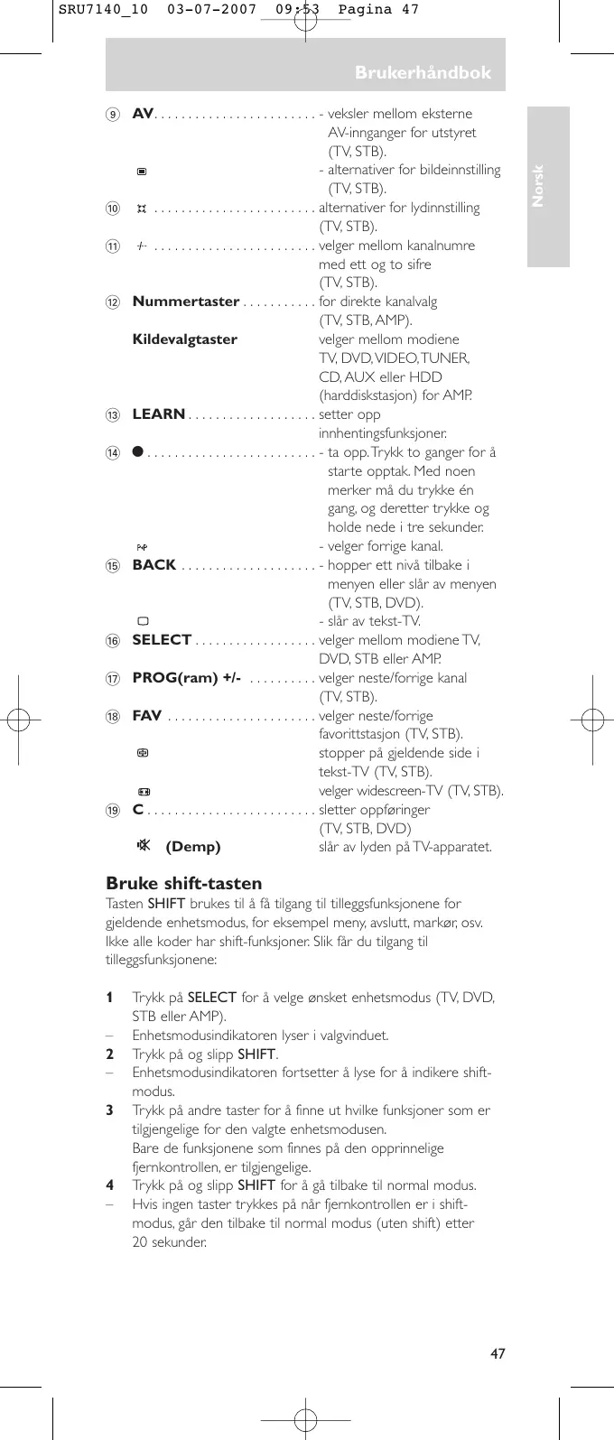 Trykk på SELECT for å velge ønsket enhetsmodus (TV, DVD, STB eller AMP). Enhetsmodusindikatoren lyser i valgvinduet. Trykk på og slipp SHIFT. Enhetsmodusindikatoren fortsetter å lyse for å indikere shiftmodus. Trykk på andre taster for å finne ut hvilke funksjoner som er tilgjengelige for den valgte enhetsmodusen. Bare de funksjonene som finnes på den opprinnelige fjernkontrollen, er tilgjengelige. Trykk på og slipp SHIFT for å gå tilbake til normal modus. Hvis ingen taster trykkes på når fjernkontrollen er i shiftmodus, går den tilbake til normal modus (uten shift) etter 20 sekunder.