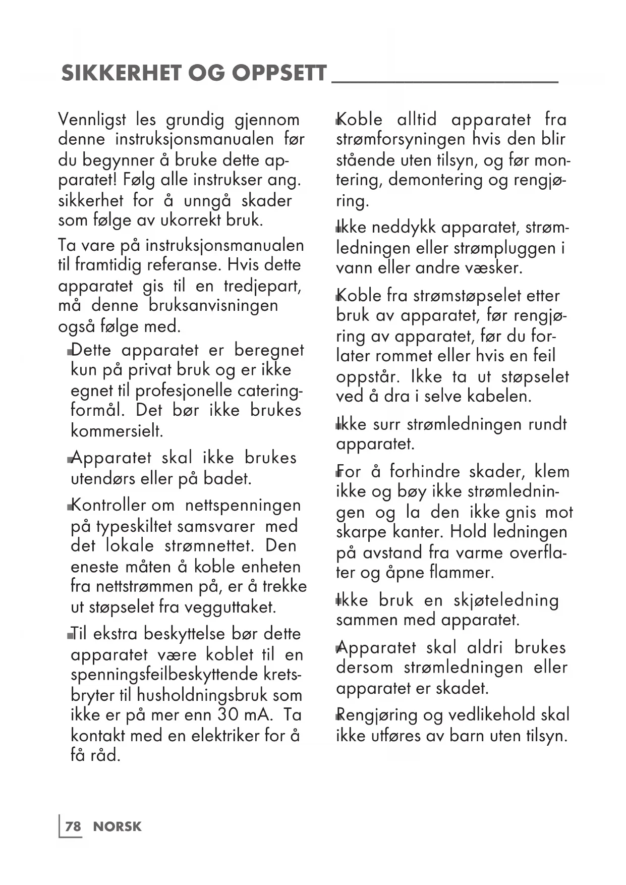 Dette apparatet er beregnet kun på privat bruk og er ikke egnet til profesjonelle catering- formål. Det bør ikke brukes kommersielt.