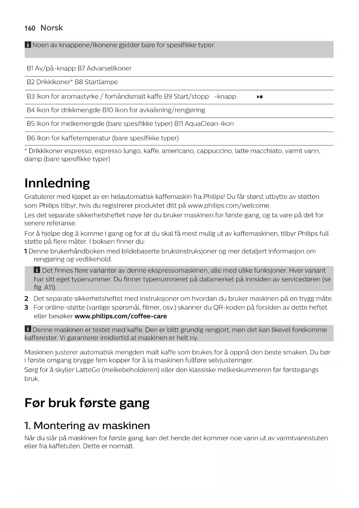 - Drikkikoner espresso, espresso lungo, kaffe, americano, cappuccino, latte macchiato, varmt vann, damp (bare spesifikke typer) Innledning Gratulerer med kjøpet av en helautomatisk kaffemaskin fra Philips! Du får størst utbytte av støtten som Philips tilbyr, hvis du registrerer produktet ditt på www.philips.com/welcome. Les det separate sikkerhetsheftet nøye før du bruker maskinen for første gang, og ta vare på det for senere referanse. For å hjelpe deg å komme i gang og for at du skal få mest mulig ut av kaffemaskinen, tilbyr Philips full støtte på flere måter. I boksen finner du: 1 Denne brukerhåndboken med bildebaserte bruksinstruksjoner og mer detaljert informasjon om rengjøring og vedlikehold. Det finnes flere varianter av denne ekspressomaskinen, alle med ulike funksjoner. Hver variant har sitt eget typenummer. Du finner typenummeret på datamerket på innsiden av servicedøren (se fig. A11). 2 Det separate sikkerhetsheftet med instruksjoner om hvordan du bruker maskinen på en trygg måte. 3 For online-støtte (vanlige spørsmål, filmer, osv.) skanner du QR-koden på forsiden av dette heftet eller besøker www.philips.com/coffee-care Denne maskinen er testet med kaffe. Den er blitt grundig rengjort, men det kan likevel forekomme kafferester. Vi garanterer imidlertid at maskinen er helt ny. Maskinen justerer automatisk mengden malt kaffe som brukes for å oppnå den beste smaken. Du bør i første omgang brygge fem kopper for å la maskinen fullføre selvjusteringer. Sørg for å skyller LatteGo (melkebeholderen) eller den klassiske melkeskummeren før førstegangs bruk. Før bruk første gang