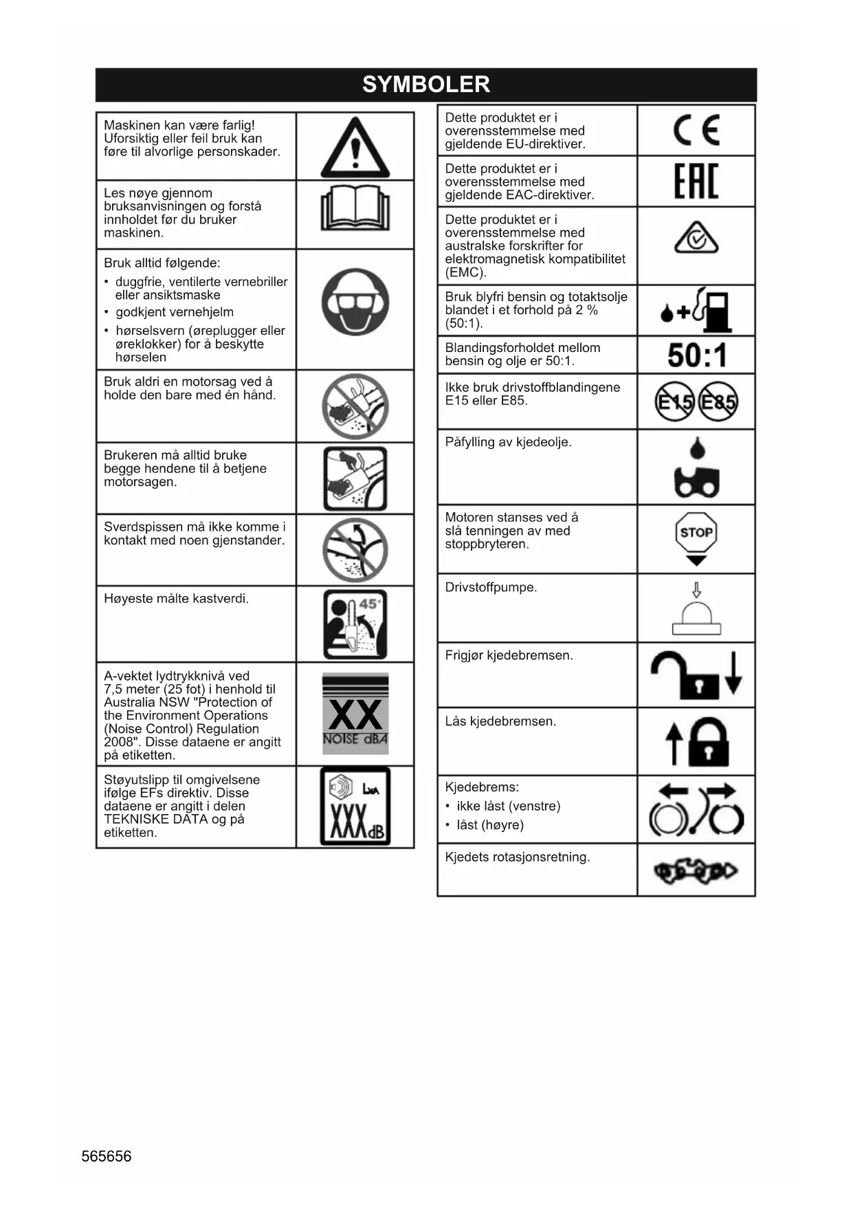 - hørselsvern (øreplugger eller øreklokker) for å beskytte hørselen Bruk aldri en motorsag ved å holde den bare med én hånd. Brukeren må alltid bruke begge hendene til å betjene motorsagen. Sverdspissen må ikke komme i kontakt med noen gjenstander. Høyeste målte kastverdi. A-vektet lydtrykknivå ved 7,5 meter (25 fot) i henhold til Australia NSW "Protection of the Environment Operations (Noise Control) Regulation 2008". Disse dataene er angitt på etiketten.