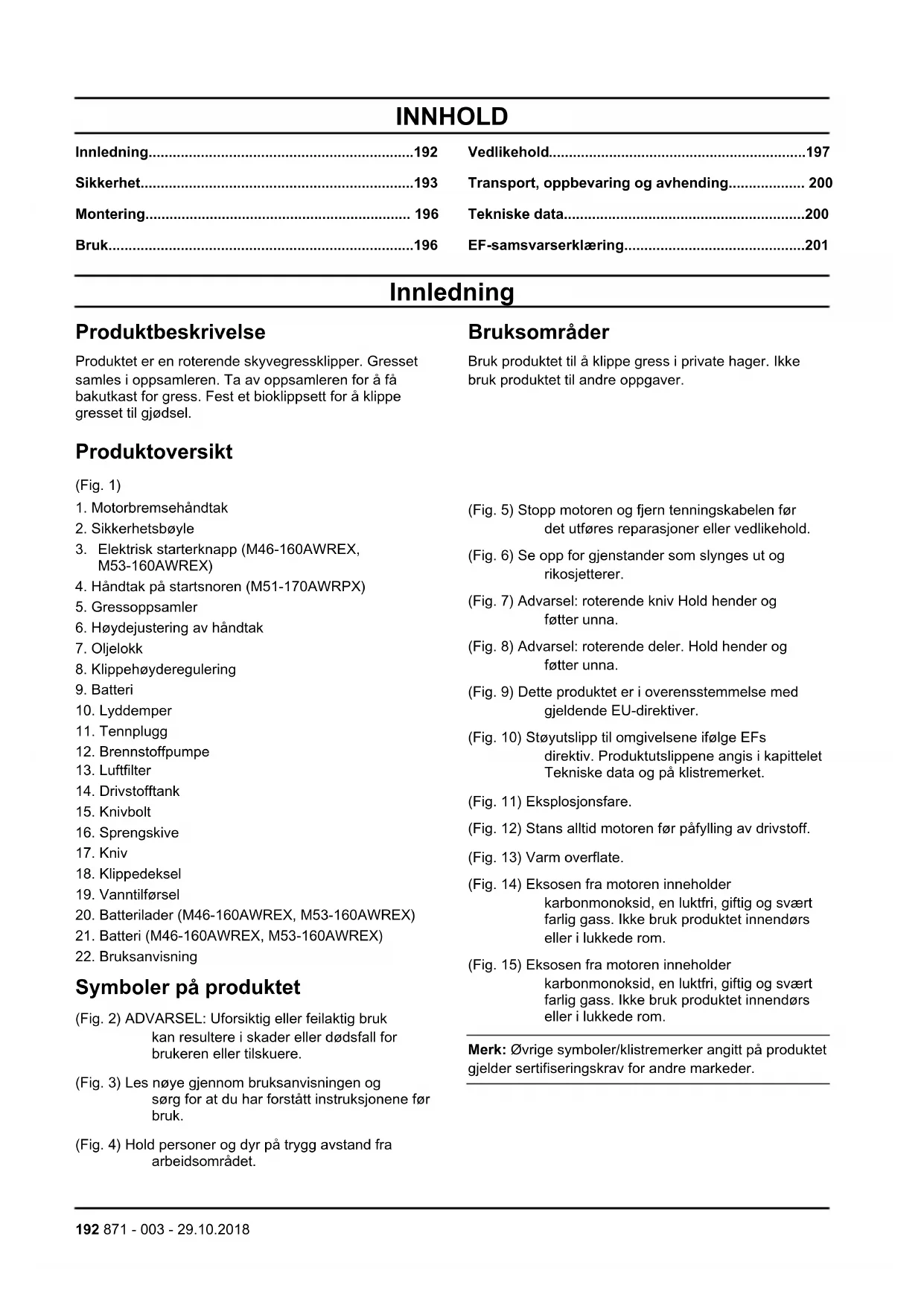 Symboler på produktet (Fig. 2) ADVARSEL: Uforsiktig eller feilaktig bruk kan resultere i skader eller dødsfall for brukeren eller tilskuere. (Fig. 3) Les nøye gjennom bruksanvisningen og sørg for at du har forstått instruksjonene før bruk. (Fig. 4) Hold personer og dyr på trygg avstand fra arbeidsområdet. (Fig. 5) Stopp motoren og fjern tenningskabelen før det utføres reparasjoner eller vedlikehold. (Fig. 6) Se opp for gjenstander som slynges ut og rikosjetterer. (Fig. 7) Advarsel: roterende kniv Hold hender og føtter unna. (Fig. 8) Advarsel: roterende deler. Hold hender og føtter unna. (Fig. 9) Dette produktet er i overensstemmelse med gjeldende EU-direktiver. (Fig. 10) Støyutslipp til omgivelsene ifølge EFs direktiv. Produktutslippene angis i kapittelet Tekniske data og på klistremerket. (Fig. 11) Eksplosjonsfare. (Fig. 12) Stans alltid motoren før påfylling av drivstoff. (Fig. 13) Varm overflate. (Fig. 14) Eksosen fra motoren inneholder karbonmonoksid, en luktfri, giftig og svært farlig gass. Ikke bruk produktet innendørs eller i lukkede rom. (Fig. 15) Eksosen fra motoren inneholder karbonmonoksid, en luktfri, giftig og svært farlig gass. Ikke bruk produktet innendørs eller i lukkede rom. Merk: Øvrige symboler/klistremerker angitt på produktet gjelder sertifiseringskrav for andre markeder. 192 871 - 003 - 29.10.2018EU V ADVARSEL: Tukling med motoren opphever EU-type-godkjenningen til dette produktet. Produktansvar Som nevnt i lovverket om produktansvar er vi ikke ansvarlig for skader som produktet vårt forårsaker, hvis