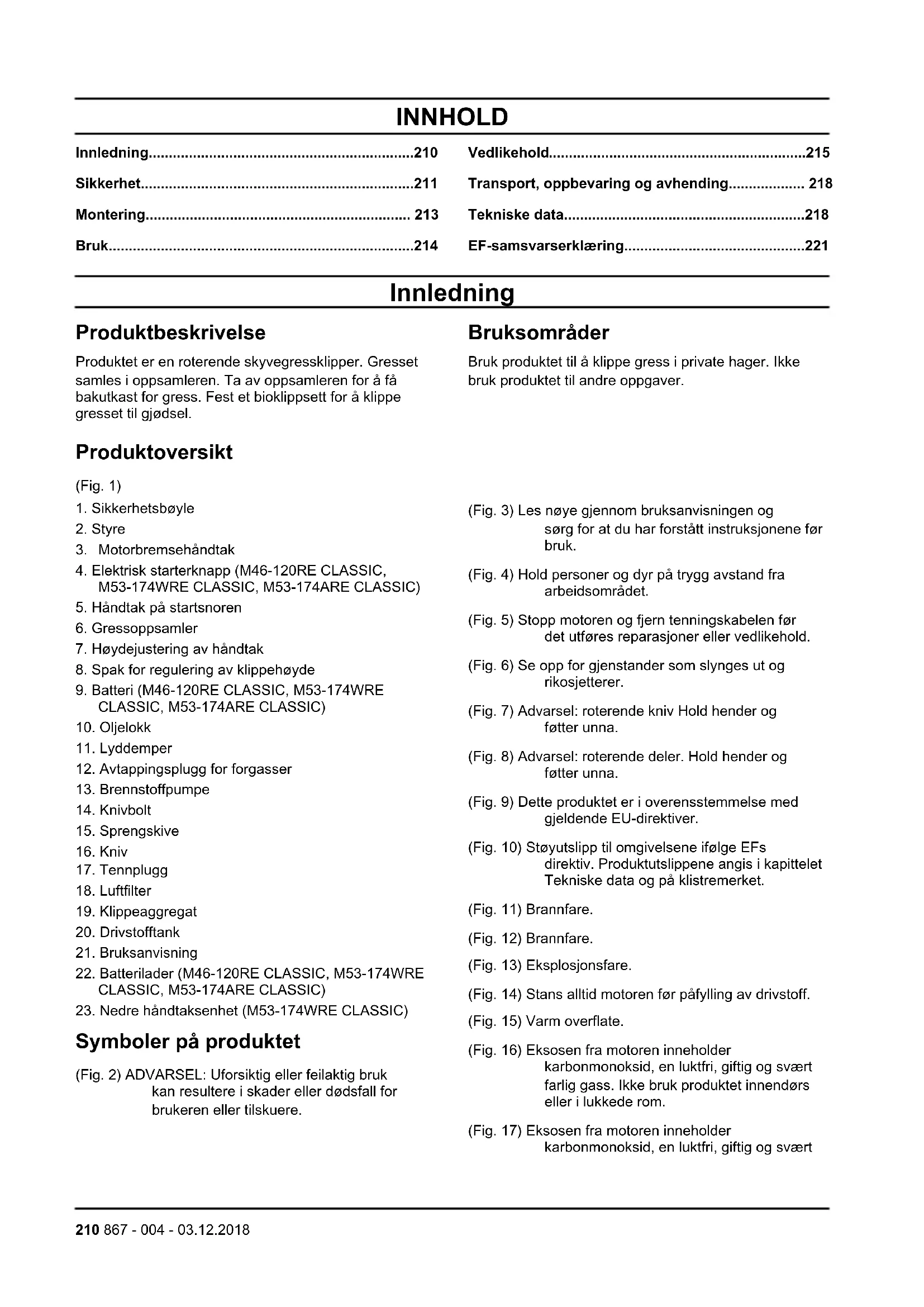 Symboler på produktet (Fig. 2) ADVARSEL: Uforsiktig eller feilaktig bruk kan resultere i skader eller dødsfall for brukeren eller tilskuere. (Fig. 3) Les nøye gjennom bruksanvisningen og sørg for at du har forstått instruksjonene før bruk. (Fig. 4) Hold personer og dyr på trygg avstand fra arbeidsområdet. (Fig. 5) Stopp motoren og fjern tenningskabelen før det utføres reparasjoner eller vedlikehold. (Fig. 6) Se opp for gjenstander som slynges ut og rikosjetterer. (Fig. 7) Advarsel: roterende kniv Hold hender og føtter unna. (Fig. 8) Advarsel: roterende deler. Hold hender og føtter unna. (Fig. 9) Dette produktet er i overensstemmelse med gjeldende EU-direktiver. (Fig. 10) Støyutslipp til omgivelsene ifølge EFs direktiv. Produktutslippene angis i kapittelet Tekniske data og på klistremerket. (Fig. 11) Brannfare. (Fig. 12) Brannfare. (Fig. 13) Eksplosjonsfare. (Fig. 14) Stans alltid motoren før påfylling av drivstoff. (Fig. 15) Varm overflate. (Fig. 16) Eksosen fra motoren inneholder karbonmonoksid, en luktfri, giftig og svært farlig gass. Ikke bruk produktet innendørs eller i lukkede rom. (Fig. 17) Eksosen fra motoren inneholder karbonmonoksid, en luktfri, giftig og svært 210 867 - 004 - 03.12.2018farlig gass. Ikke bruk produktet innendørs eller i lukkede rom. Merk: Øvrige symboler/klistremerker angitt på produktet gjelder sertifiseringskrav for andre markeder. EU V ADVARSEL: Tukling med motoren opphever EU-type-godkjenningen til dette produktet. Produktansvar Som nevnt i lovverket om produktansvar er vi ikke ansvarlig for skader som produktet vårt forårsaker, i følgende tilfeller: