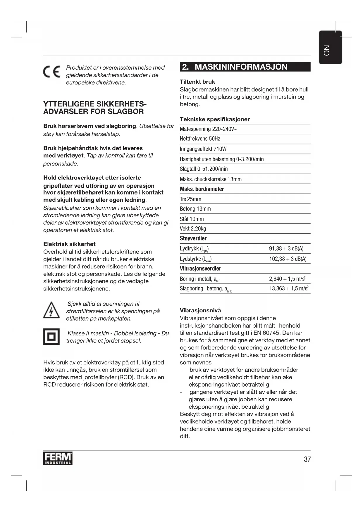 Tiltenkt bruk Slagboremaskinen har blitt designet til å bore hull i tre, metall og plass og slagboring i murstein og betong. Tekniske spesikasjoner Matespenning 220-240 V~ Nettfrekvens 50 Hz Inngangseffekt 710W Hastighet uten belastning 0-3.200 /min Slagtall 0-51.200 /min Maks. chuckstørrelse 13 mm Maks. bordiameter Tre 25 mm Betong 13 mm Stål 10 mm Vekt 2.20 kg Støyverdier Lydtrykk (L