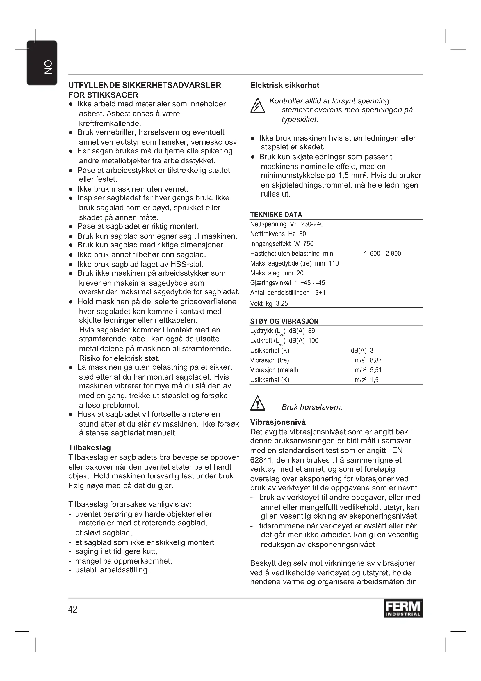 UTFYLLENDE SIKKERHETSADVARSLER FOR STIKKSAGER ● Ikke arbeid med materialer som inneholder asbest. Asbest anses å være kreftfremkallende. ● Bruk vernebriller, hørselsvern og eventuelt annet verneutstyr som hansker, vernesko osv. ● Før sagen brukes må du fjerne alle spiker og andre metallobjekter fra arbeidsstykket. ● Påse at arbeidsstykket er tilstrekkelig støttet eller festet. ● Ikke bruk maskinen uten vernet. ● Inspiser sagbladet før hver gangs bruk. Ikke bruk sagblad som er bøyd, sprukket eller skadet på annen måte. ● Påse at sagbladet er riktig montert. ● Bruk kun sagblad som egner seg til maskinen. ● Bruk kun sagblad med riktige dimensjoner. ● Ikke bruk annet tilbehør enn sagblad. ● Ikke bruk sagblad laget av HSS-stål. ● Bruk ikke maskinen på arbeidsstykker som krever en maksimal sagedybde som overskrider maksimal sagedybde for sagbladet. ● Hold maskinen på de isolerte gripeoveratene hvor sagbladet kan komme i kontakt med skjulte ledninger eller nettkabelen. Hvis sagbladet kommer i kontakt med en strømførende kabel, kan også de utsatte metalldelene på maskinen bli strømførende. Risiko for elektrisk støt. ● La maskinen gå uten belastning på et sikkert sted etter at du har montert sagbladet. Hvis maskinen vibrerer for mye må du slå den av med en gang, trekke ut støpslet og forsøke å løse problemet. ● Husk at sagbladet vil fortsette å rotere en stund etter at du slår av maskinen. Ikke forsøk å stanse sagbladet manuelt. Tilbakeslag Tilbakeslag er sagbladets brå bevegelse oppover eller bakover når den uventet støter på et hardt objekt. Hold maskinen forsvarlig fast under bruk. Følg nøye med på det du gjør. Tilbakeslag forårsakes vanligvis av: - uventet berøring av harde objekter eller materialer med et roterende sagblad, - et sløvt sagblad, - et sagblad som ikke er skikkelig montert, - saging i et tidligere kutt, - mangel på oppmerksomhet; - ustabil arbeidsstilling. Elektrisk sikkerhet