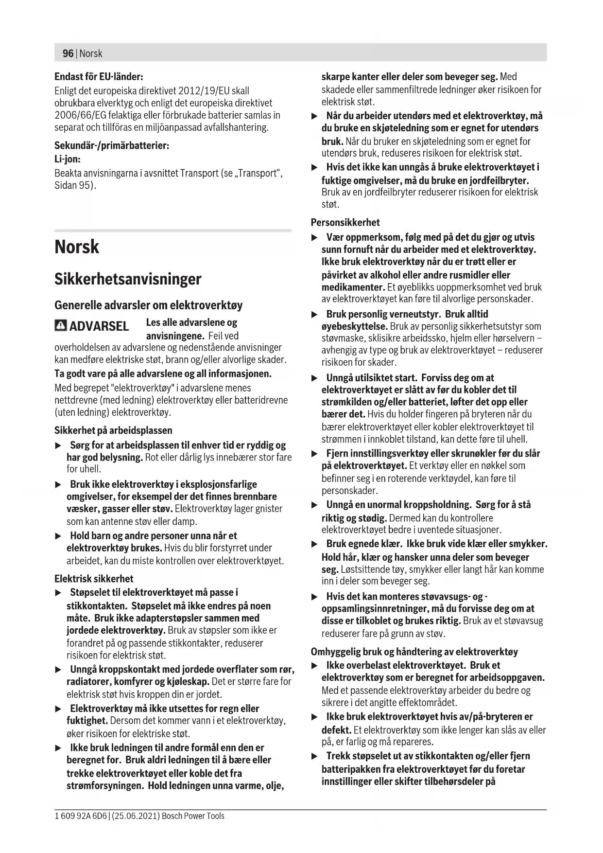 Vibrasjonsverdien som er angitt i disse anvisningene er målt iht. en standardisert målemetode og kan brukes til sammenligning av elektroverktøy med hverandre. Det egner seg også til en foreløpig vurdering av vibrasjonsbelastningen. Det angitte vibrasjonsnivået representerer de hovedsakelige anvendelsene til elektroverktøyet. Hvis elektroverktøyet brukes til andre oppgaver, med avvikende innsatsverktøy eller utilstrekkelig vedlikehold, kan imidlertid vibrasjonsnivået avvike. Dette kan føre til en betydelig økning av vibrasjonsbelastningen over hele arbeidstidsrommet. Til en nøyaktig vurdering av vibrasjonsbelastningen skal det også tas hensyn til de tidene maskinen er slått av eller går, men ikke virkelig brukes. Dette kan tydelig redusere vibrasjonsbelastningen over hele arbeidstidsrommet. Bestem ekstra sikkerhetstiltak til beskyttelse av brukeren mot vibrasjonenes virkning, som for eksempel: Vedlikehold av elektroverktøy og innsatsverktøy, holde hendene varme, organisere arbeidsforløpene. Montering Opplading av batteriet u Bruk bare laderne som er oppført i de tekniske spesifikasjonene. Kun disse laderne er tilpasset til Li- ion-batteriet som er brukt i elektroverktøyet. Merk: Batteriet er delvis ladet ved levering. For å sikre full effekt fra batteriet må du lade det helt opp i laderen før første gangs bruk. Litium-ion-batteriet kan lades opp til enhver tid uten at levetiden forkortes. Det skader ikke batteriet å avbryte oppladingen. Li-Ion-batteriet har "Electronic Cell Protection (ECP)" som beskytter mot dyputladning. Når batteriet er utladet, kobles elektroverktøyet ut med en beskyttelseskobling: Innsatsverktøyet beveger seg ikke lenger. u Ikke fortsett å trykke på av/på-bryteren etter automatisk utkobling av elektroverktøyet. Batteriet kan ta skade. Følg informasjonene om kassering. 1 609 92A 6D6 | (25.06.2021) Bosch Power ToolsNorsk | 101 Fjerning av batteriet For å ta ut batteriet (6) trykker du på utløserknappen (8) og trekker batteriet ut av elektroverktøyet. Ikke bruk makt. Ladenivåindikator Indikatoren for batteriets ladenivå (5) består av tre grønne lysdioder og viser batteriets ladenivå i noen sekunder når av/ på-bryteren (4) trykkes halvveis eller helt inn. LED Kapasitet Kontinuerlig lys 3x grønt ≥ 66% Kontinuerlig lys 2x grønt 33 – 66% Kontinuerlig lys 1x grønt 11 – 33% Blinker langsomt grønt 1 gang ≤ 10% De tre lysdiodene til batteriets ladenivåindikator blinker raskt når batteritemperaturen er utenfor driftstemperaturområdet fra –30 til +65 °C og/eller overbelastningsvernet er aktivert. Montere verneinnretning u Ta alltid batteriet ut av elektroverktøyet før arbeider på elektroverktøyet utføres (f.eks. vedlikehold, verktøyskifte osv.) og før transport og oppbevaring. Det er fare for skader hvis du trykker på av/på-bryteren ved en feiltagelse. Merknad: Etter brudd på slipeskiven under drift eller skader på festeinnretningene på vernedekselet/elektroverktøyet må elektroverktøyet omgående sendes inn til kundeservice. Adresser se avsnittet "Kundeservice og kundeveiledning". Vernedeksel for sliping Legg vernedekselet (10) på festet på elektroverktøyet. Kodetappene på vernedekselet skal stemme overens med festet. Mens du gjør dette, trykker du på utløserspaken (1) og holder den inne. Trykk vernedekselet (10) på spindelhalsen helt til kragen på vernedekselet sitter på flensen til elektroverktøyet, og drei vernedekselet til det høres at det festes. Tilpass plasseringen av vernedekselet (10) etter arbeidsoperasjonen. Dette gjør du ved å trykke utløserspaken (1) opp og dreie vernedekselet (10) til ønsket stilling. u Still alltid inn vernedekselet (10) slik at begge tappene på utløserspaken (1) griper inn i de tilsvarende utsparingene til vernedekselet (10) . u Still inn vernedekselet (10) slik at gnistregn i retning brukeren unngås. u Vernedekselet (10) skal bare kunne dreies ved aktivering av utløserspaken (1) ! Ellers må elektroverktøyet ikke brukes videre og må leveres til kundeservice. Merknad: Kodetappene på vernedekselet (10) sikrer at bare et vernedeksel som passer til elektroverktøyet, kan monteres. Vernedeksel for kapping u Ved kapping med bundne slipemidler må du alltid bruke vernedekselet for kapping (13). u Sørg for tilstrekkelig støvavsug ved kapping i stein. Vernedekselet for kapping (13) monteres som vernedekselet for sliping (10). Støvavsugsdeksel for kapping med styreskinner Støvavsugsdekselet for kapping med styreskinner (24) monteres som vernedekselet for sliping (10). Ekstrahåndtak u Du må ikke bruke elektroverktøyet uten ekstrahåndtaket (9). Skru fast ekstrahåndtaket (9) til høyre eller venstre på girhodet, avhengig av hvordan du arbeider. Vibrasjonsdempende ekstrahåndtak Skru ekstrahåndtaket (9) inn på høyre eller venstre side av girhodet avhengig av typen bruk. Det vibrasjonsdempende ekstrahåndtaket gir mulighet til sikrere og mer komfortabelt arbeid med lite vibrasjoner. u Du må aldri endre på ekstrahåndtaket. Ekstrahåndtaket må ikke brukes hvis det er skadet. Håndbeskyttelse u Monter alltid håndbeskyttelsen når du skal arbeide med gummislipeskiven (19) eller koppbørsten/ skivebørsten/lamellslipeskiven (18). Fest håndbeskyttelsen (18) med ekstrahåndtaket (9). Montere slipeverktøy u Ta alltid batteriet ut av elektroverktøyet før arbeider på elektroverktøyet utføres (f.eks. vedlikehold, verktøyskifte osv.) og før transport og oppbevaring. Det er fare for skader hvis du trykker på av/på-bryteren ved en feiltagelse. u Ikke berør slipe- og kappeskiver før de er avkjølt. Skivene blir svært varme under arbeidet. Rengjør slipespindelen (17)og alle delene som skal monteres. Bosch Power Tools 1 609 92A 6D6 | (25.06.2021)102 | Norsk Trykk på spindellåseknappen (2) for å låse slipespindelen når du skal spenne fast og løsne slipeverktøyet. u Trykk på spindellåseknappen bare når slipespindelen er stanset. Elektrove