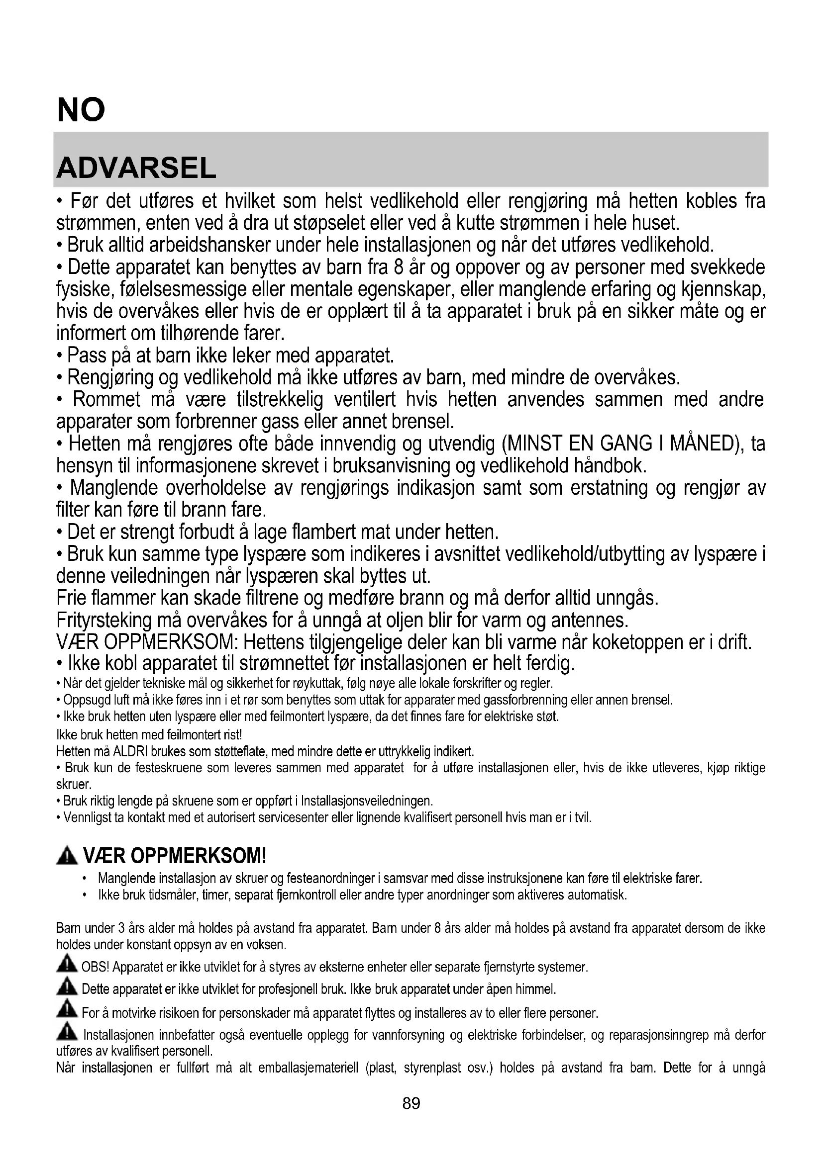 - Rommet må være tilstrekkelig ventilert hvis hetten anvendes sammen med andre apparater som forbrenner gass eller annet brensel.