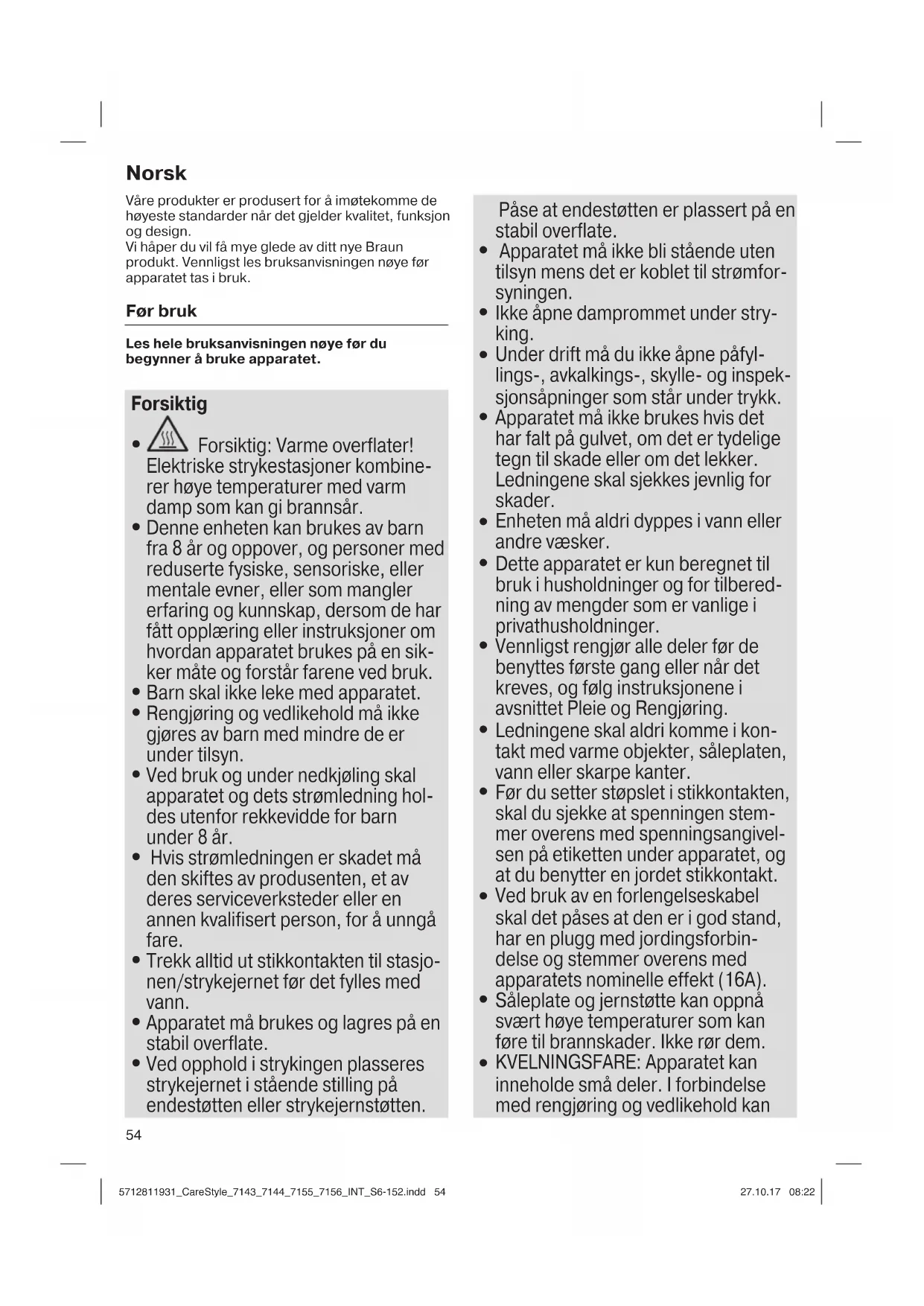 Forsiktig: Varme overflater! Elektriske strykestasjoner kombine- rer høye temperaturer med varm damp som kan gi brannsår.
