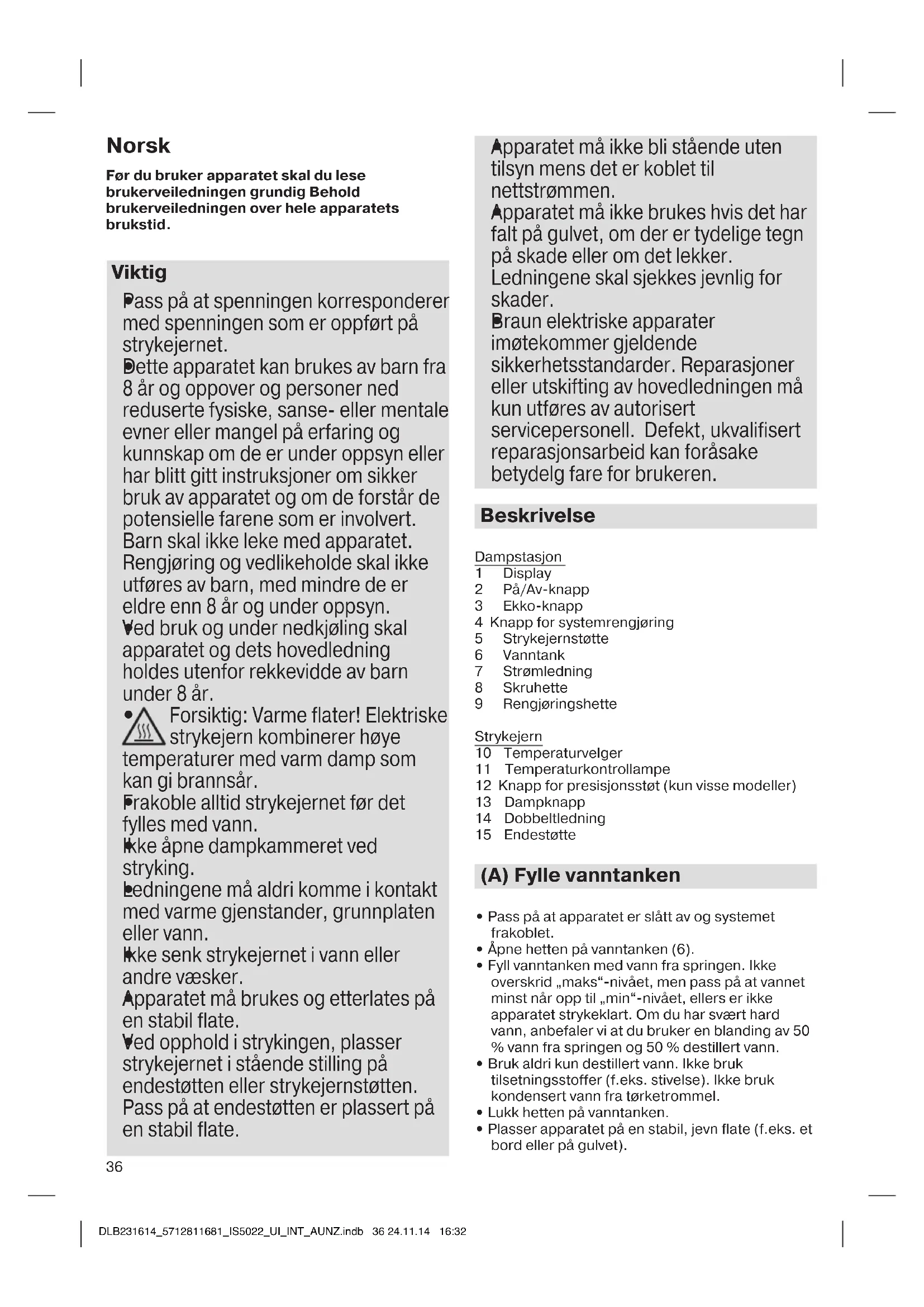 Braun elektriske apparater imøtekommer gjeldende sikkerhetsstandarder. Reparasjoner eller utskifting av hovedledningen må kun utføres av autorisert servicepersonell. Defekt, ukvalifisert reparasjonsarbeid kan foråsake betydelg fare for brukeren. Beskrivelse Dampstasjon 1 Display 2 På/Av-knapp 3 Ekko-knapp 4 Knapp for systemrengjøring 5 Strykejernstøtte 6 Vanntank 7 Strømledning 8 Skruhette 9 Rengjøringshette Strykejern 10 Temperaturvelger 11 Temperaturkontrollampe 12 Knapp for presisjonsstøt (kun visse modeller) 13 Dampknapp 14 Dobbeltledning 15 Endestøtte (A) Fylle vanntanken