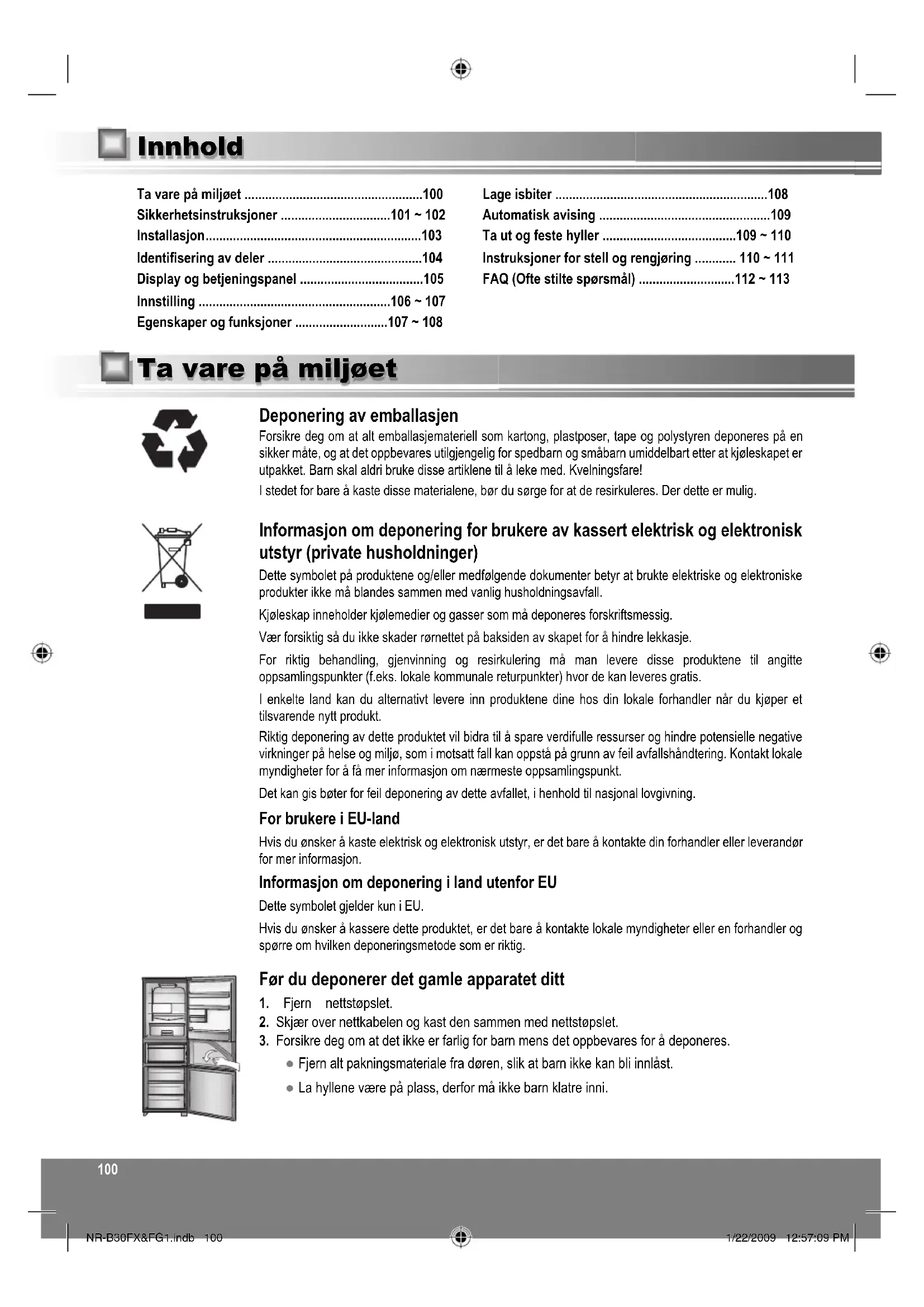- ~ 111 FAQ (Ofte stilte spørsmål) ~ 113 Innhold Deponering av emballasjen Forsikre deg om at alt emballasjemateriell som kartong, plastposer, tape og polystyren deponeres på en sikker måte, og at det oppbevares utilgjengelig for spedbarn og småbarn umiddelbart etter at kjøleskapet er utpakket. Barn skal aldri bruke disse artiklene til å leke med. Kvelningsfare! I stedet for bare å kaste disse materialene, bør du sørge for at de resirkuleres. Der dette er mulig. Informasjon om deponering for brukere av kassert elektrisk og elektronisk utstyr (private husholdninger) Dette symbolet på produktene og/eller medfølgende dokumenter betyr at brukte elektriske og elektroniske produkter ikke må blandes sammen med vanlig husholdningsavfall. Kjøleskap inneholder kjølemedier og gasser som må deponeres forskriftsmessig. Vær forsiktig så du ikke skader rørnettet på baksiden av skapet for å hindre lekkasje. For riktig behandling, gjenvinning og resirkulering må man levere disse produktene til angitte oppsamlingspunkter (f.eks. lokale kommunale returpunkter) hvor de kan leveres gratis. I enkelte land kan du alternativt levere inn produktene dine hos din lokale forhandler når du kjøper et tilsvarende nytt produkt. Riktig deponering av dette produktet vil bidra til å spare verdifulle ressurser og hindre potensielle negative virkninger på helse og miljø, som i motsatt fall kan oppstå på grunn av feil avfallshåndtering. Kontakt lokale myndigheter for å få mer informasjon om nærmeste oppsamlingspunkt. Det kan gis bøter for feil deponering av dette avfallet, i henhold til nasjonal lovgivning. For brukere i EU-land Hvis du ønsker å kaste elektrisk og elektronisk utstyr, er det bare å kontakte din forhandler eller leverandør for mer informasjon. Informasjon om deponering i land utenfor EU Dette symbolet gjelder kun i EU. Hvis du ønsker å kassere dette produktet, er det bare å kontakte lokale myndigheter eller en forhandler og spørre om hvilken deponeringsmetode som er riktig. Før du deponerer det gamle apparatet ditt p. 112