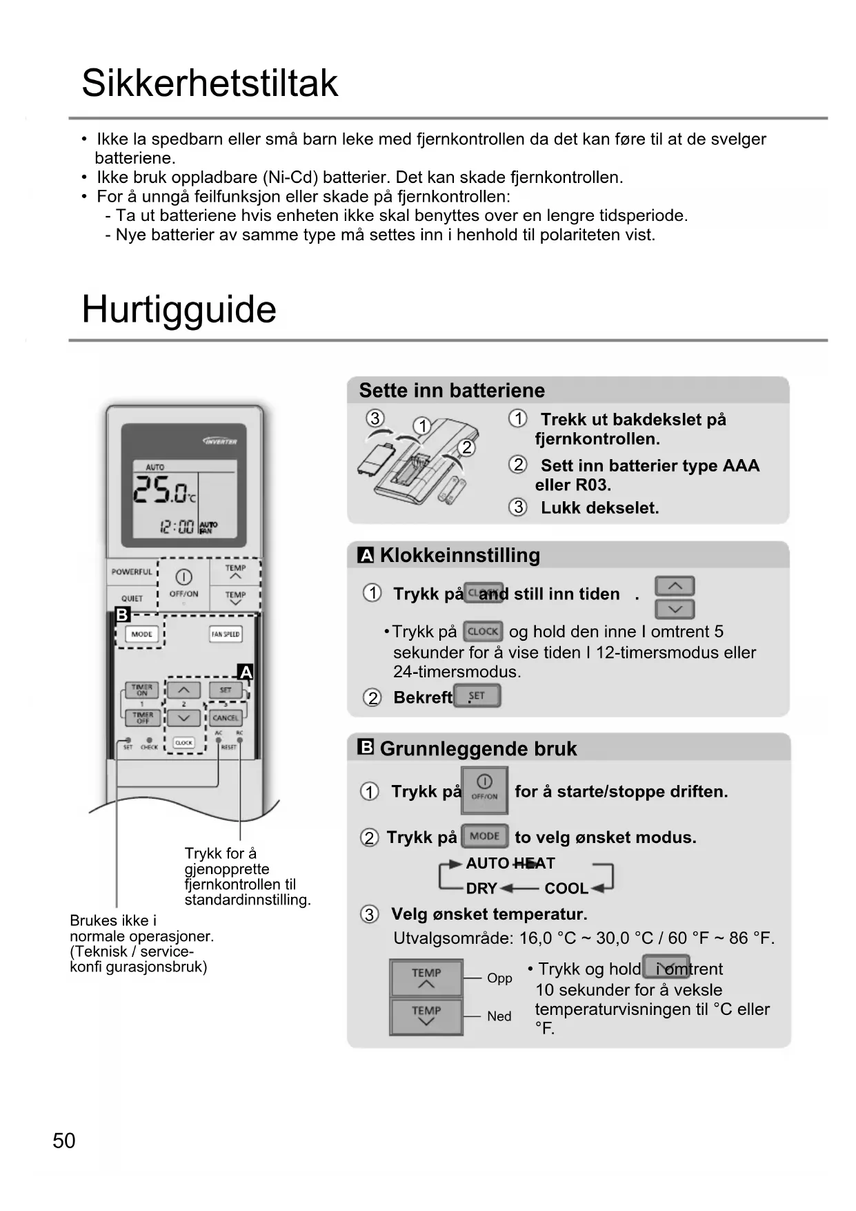 - Betjening med tidsbryter er basert på klokken som er innstilt på fjernkontrollen og gjentas daglig når det er stilt inn. For innstilling av klokken, se Hurtigveiledning. Når fjernkontrollen med ledning er i bruk, kan tidsinnstillingene fra den trådløse fjernkontrollen være kansellert. 2 sett med PÅ- og AV-timere er tilgjengelige for å slå enheten PÅ eller AV til forskjellige forhåndsdefi nerte tidspunkt.52 Automatisk styring av omstart Hvis strømmen kommer tilbake etter en strømsvikt, vil driften gjenopptas automatisk etter en stund med siste driftsmodus og luftstrømretning.