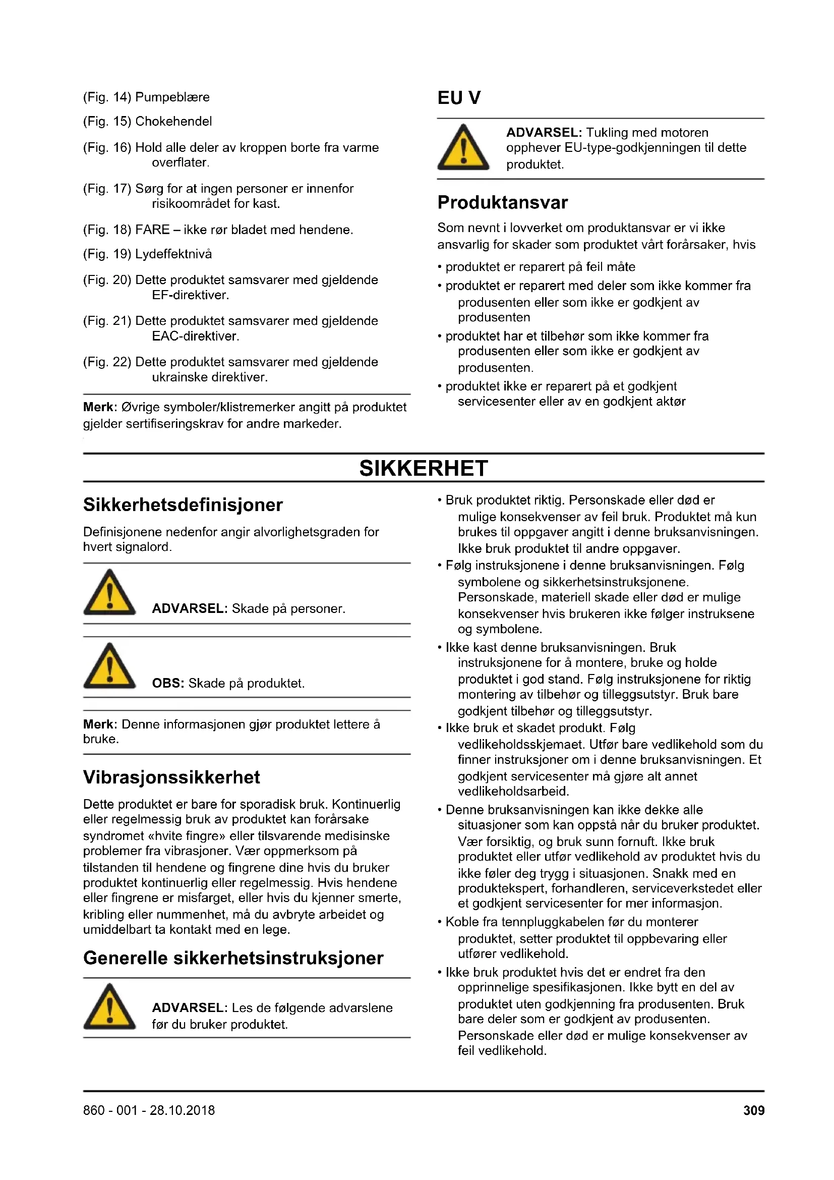 - Bruk alltid egnet personlig verneutstyr når du bruker produktet. Det personlige verneutstyret fjerner ikke risikoen for skader. Det personlige verneutstyret reduserer skadeomfanget hvis det skjer en ulykke.