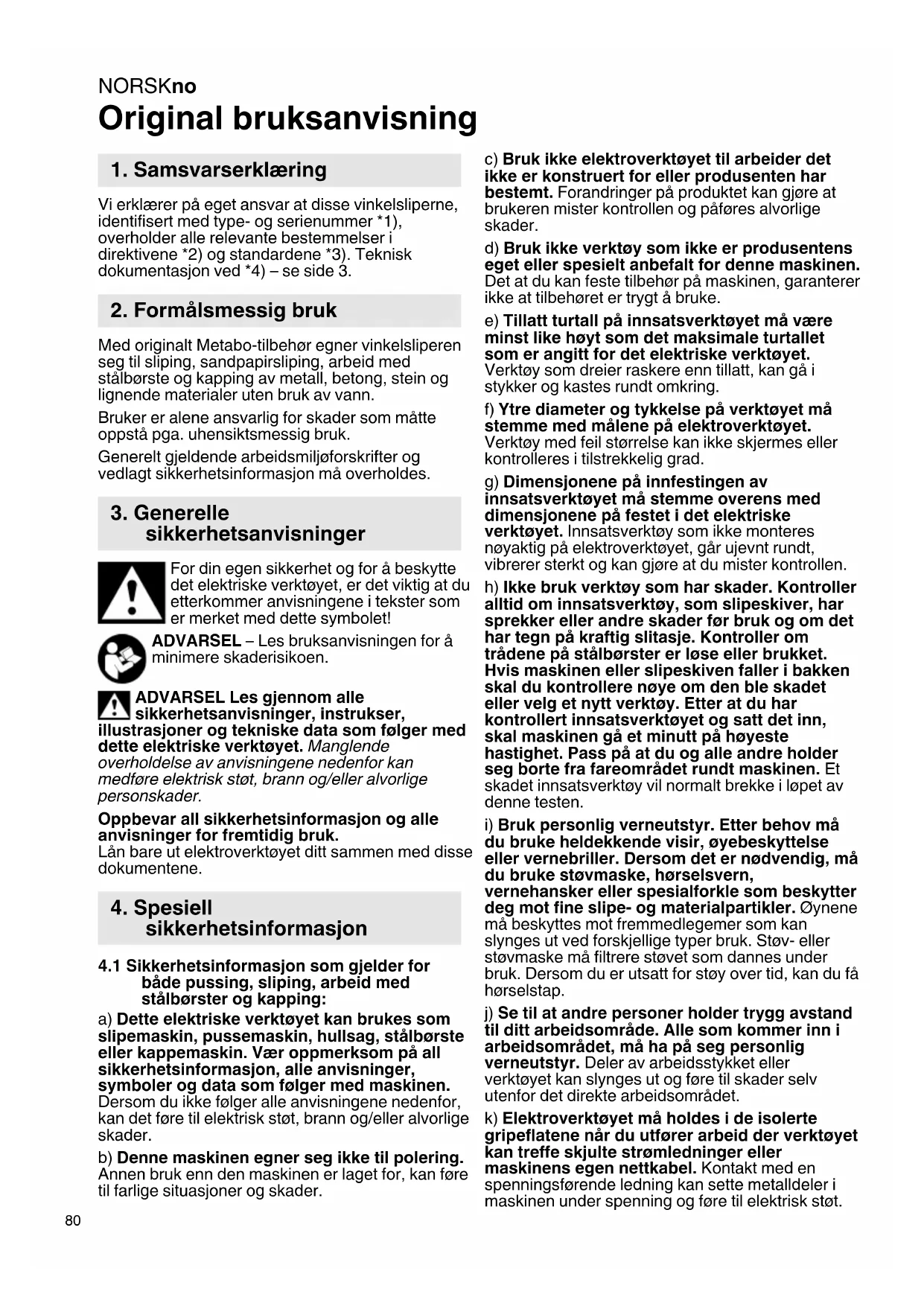 Original bruksanvisning Vi erklærer på eget ansvar at disse vinkelsliperne, identifisert med type- og serienummer *1), overholder alle relevante bestemmelser i direktivene *2) og standardene *3). Teknisk dokumentasjon ved *4) – se side 3. Med originalt Metabo-tilbehør egner vinkelsliperen seg til sliping, sandpapirsliping, arbeid med stålbørste og kapping av metall, betong, stein og lignende materialer uten bruk av vann. Bruker er alene ansvarlig for skader som måtte oppstå pga. uhensiktsmessig bruk. Generelt gjeldende arbeidsmiljøforskrifter og vedlagt sikkerhetsinformasjon må overholdes. For din egen sikkerhet og for å beskytte det elektriske verktøyet, er det viktig at du etterkommer anvisningene i tekster som er merket med dette symbolet! ADVARSEL – Les bruksanvisningen for å minimere skaderisikoen. ADVARSEL Les gjennom alle sikkerhetsanvisninger, instrukser, illustrasjoner og tekniske data som følger med dette elektriske verktøyet. Manglende overholdelse av anvisningene nedenfor kan medføre elektrisk støt, brann og/eller alvorlige personskader. Oppbevar all sikkerhetsinformasjon og alle anvisninger for fremtidig bruk. Lån bare ut elektroverktøyet ditt sammen med disse dokumentene.