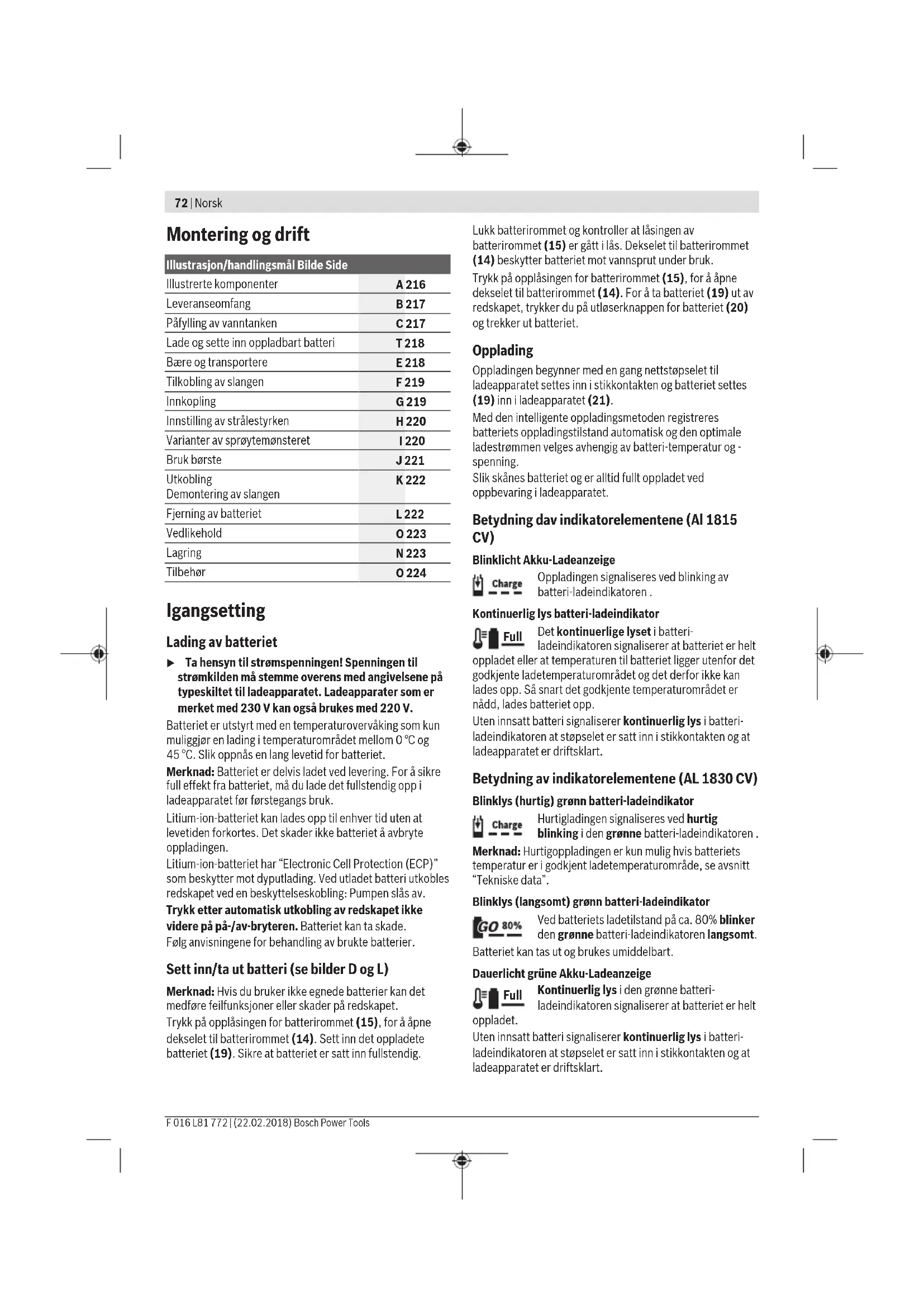 Lad bare Bosch Li-lon-batterier fra en kapasitet pa 1,5 Ah (fra 3 Akkuceller). Batterispenningen ma stemme overens med laderens batteriladespenning. Du ma ikke lade batterier som ikke er oppladbare.