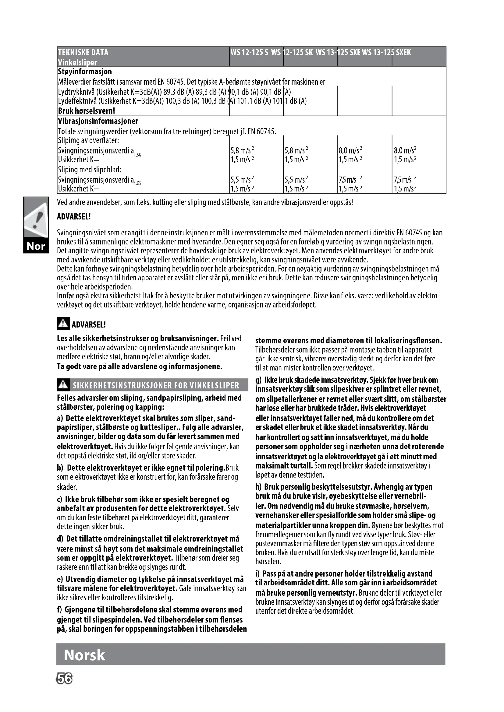 Ved andre anvendelser, som f.eks. kutting eller sliping med stålbørste, kan andre vibrasjonsverdier oppstås! ADVARSEL! Svingningsnivået som er angitt i denne instruksjonen er målt i overensstemmelse med målemetoden normert i direktiv EN 60745 og kan brukes til å sammenligne elektromaskiner med hverandre. Den egner seg også for en foreløbig vurdering av svingningsbelastningen. Det angitte svingningsnivået representerer de hovedsaklige bruk av elektroverktøyet. Men anvendes elektroverktøyet for andre bruk med avvikende utskiftbare verktøy eller vedlikeholdet er utilstrekkelig, kan svingningsnivået være avvikende. Dette kan forhøye svingningsbelastning betydelig over hele arbeidsperioden. For en nøyaktig vurdering av svingningsbelastningen må også det tas hensyn til tiden apparatet er avslått eller står på, men ikke er i bruk. Dette kan redusere svingningsbelastningen betydelig over hele arbeidsperioden. Innfør også ekstra sikkerhetstiltak for å beskytte bruker mot utvirkingen av svingningene. Disse kan f.eks. være: vedlikehold av elektro- verktøyet og det utskiftbare verktøyet, holde hendene varme, organisasjon av arbeidsforløpet. ADVARSEL! Les alle sikkerhetsinstrukser og bruksanvisninger. Feil ved overholdelsen av advarslene og nedenstående anvisninger kan medføre elektriske støt, brann og/eller alvorlige skader. Ta godt vare på alle advarslene og informasjonene.