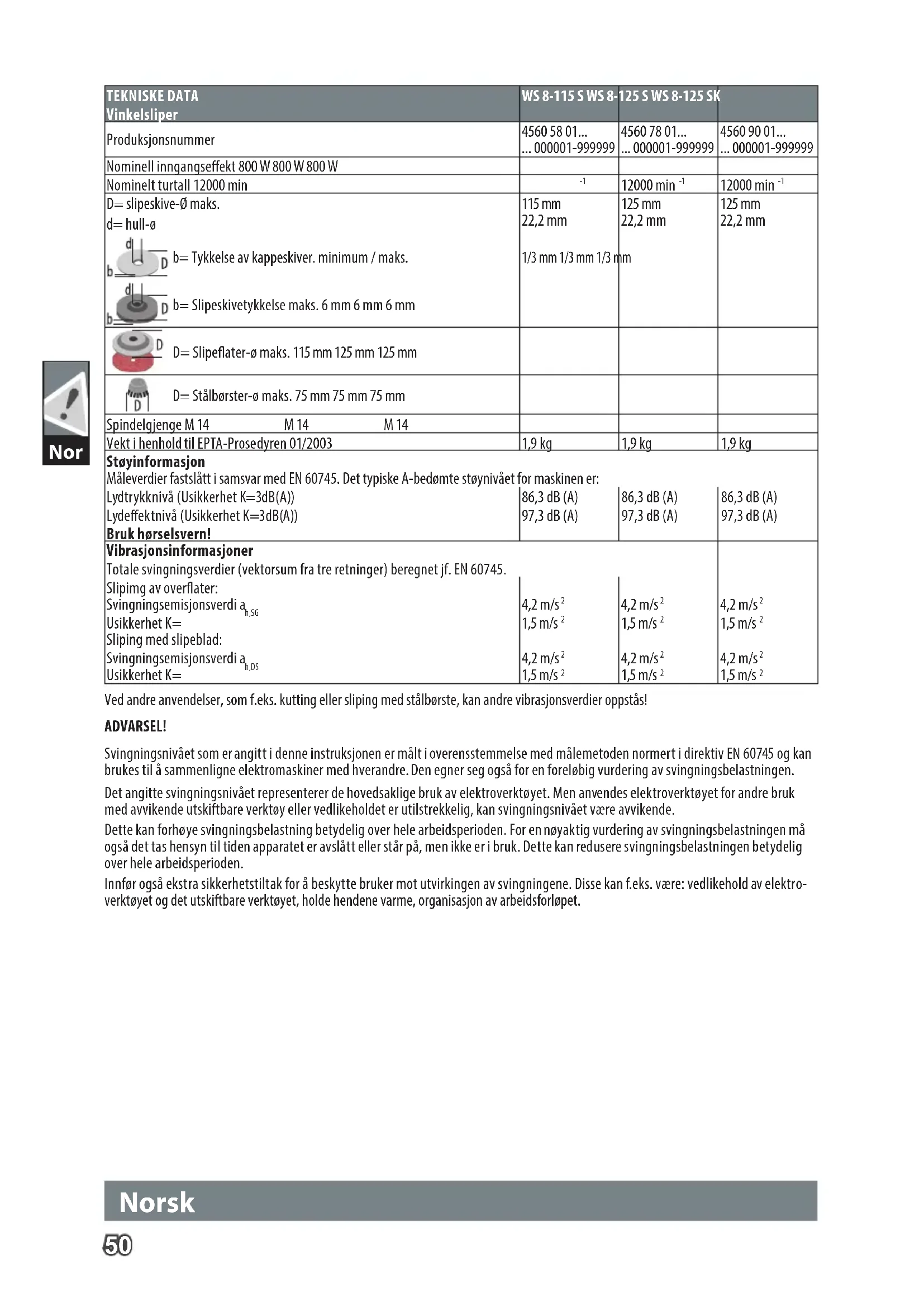 Ved andre anvendelser, som f.eks. kutting eller sliping med stålbørste, kan andre vibrasjonsverdier oppstås! ADVARSEL! Svingningsnivået som er angitt i denne instruksjonen er målt i overensstemmelse med målemetoden normert i direktiv EN 60745 og kan brukes til å sammenligne elektromaskiner med hverandre. Den egner seg også for en foreløbig vurdering av svingningsbelastningen. Det angitte svingningsnivået representerer de hovedsaklige bruk av elektroverktøyet. Men anvendes elektroverktøyet for andre bruk med avvikende utskiftbare verktøy eller vedlikeholdet er utilstrekkelig, kan svingningsnivået være avvikende. Dette kan forhøye svingningsbelastning betydelig over hele arbeidsperioden. For en nøyaktig vurdering av svingningsbelastningen må også det tas hensyn til tiden apparatet er avslått eller står på, men ikke er i bruk. Dette kan redusere svingningsbelastningen betydelig over hele arbeidsperioden. Innfør også ekstra sikkerhetstiltak for å beskytte bruker mot utvirkingen av svingningene. Disse kan f.eks. være: vedlikehold av elektro- verktøyet og det utskiftbare verktøyet, holde hendene varme, organisasjon av arbeidsforløpet.D Deutsch