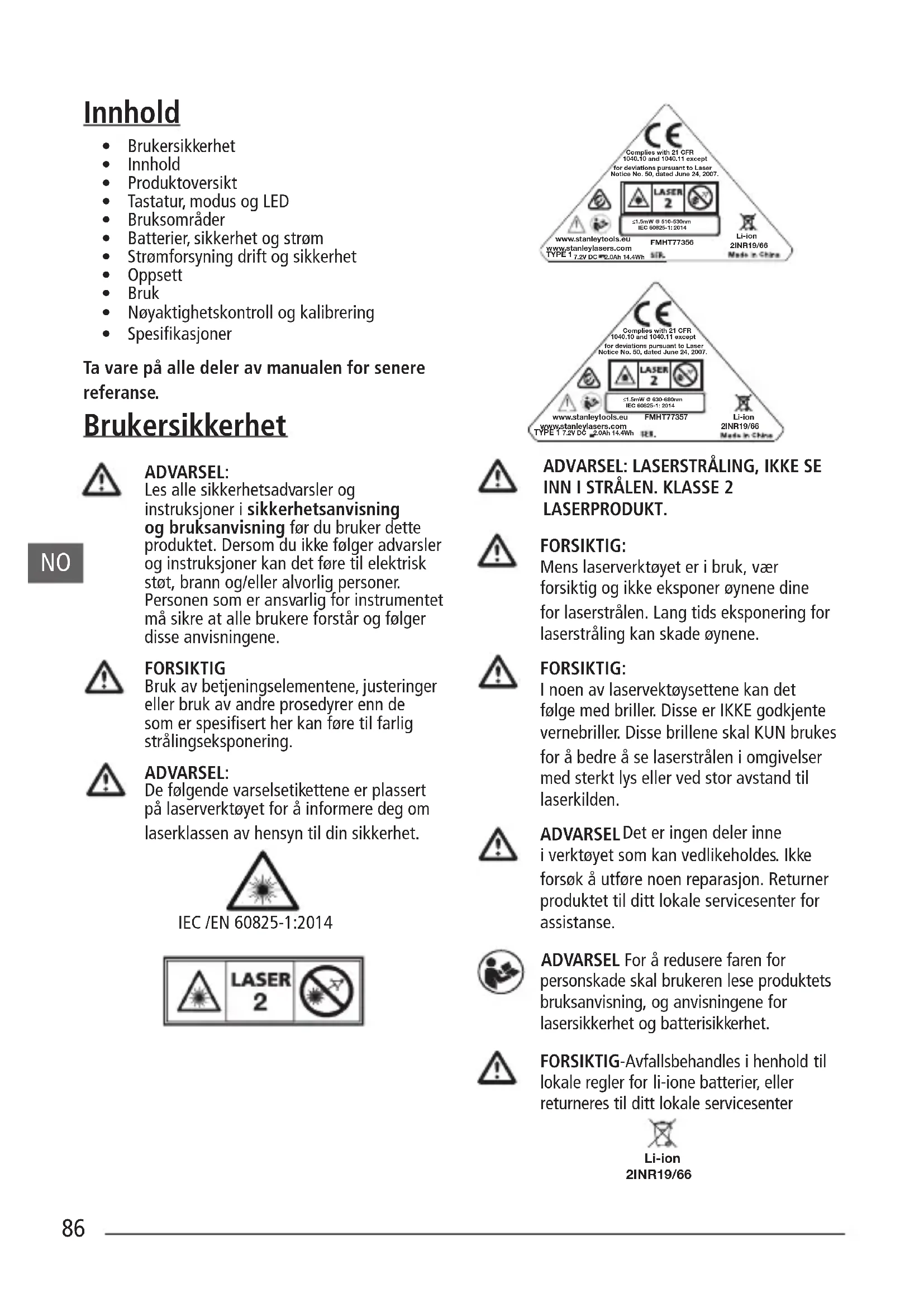 - Laserproduktet kan ikke vedlikeholdes av brukeren og må returneres til din distributør eller Stanley garanti/servicesenter ved feil eller skade. Få det verktøyet ditt vedlikeholdt av en kvalisert reparatør som kun bruker originale reservedeler. Dette vil sikre at produktets sikkerhet blir ivaretatt.89