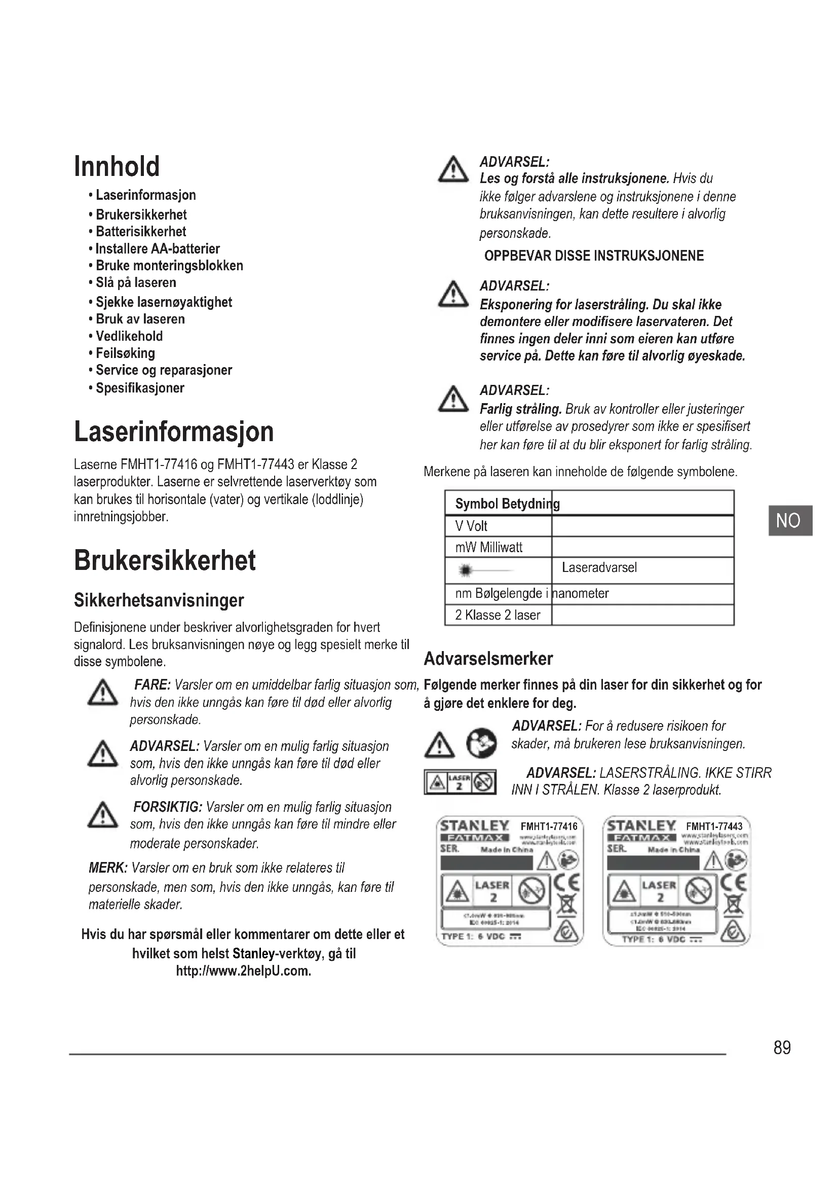 - Spesikasjoner Laserinformasjon Laserne FMHT1-77416 og FMHT1-77443 er Klasse 2 laserprodukter. Laserne er selvrettende laserverktøy som kan brukes til horisontale (vater) og vertikale (loddlinje) innretningsjobber. Brukersikkerhet Sikkerhetsanvisninger Denisjonene under beskriver alvorlighetsgraden for hvert signalord. Les bruksanvisningen nøye og legg spesielt merke til disse symbolene. FARE: Varsler om en umiddelbar farlig situasjon som, hvis den ikke unngås kan føre til død eller alvorlig personskade. ADVARSEL: Varsler om en mulig farlig situasjon som, hvis den ikke unngås kan føre til død eller alvorlig personskade. FORSIKTIG: Varsler om en mulig farlig situasjon som, hvis den ikke unngås kan føre til mindre eller moderate personskader. MERK: Varsler om en bruk som ikke relateres til personskade, men som, hvis den ikke unngås, kan føre til materielle skader. Hvis du har spørsmål eller kommentarer om dette eller et hvilket som helst Stanley-verktøy, gå til http://www.2helpU.com. ADVARSEL: Les og forstå alle instruksjonene. Hvis du ikke følger advarslene og instruksjonene i denne bruksanvisningen, kan dette resultere i alvorlig personskade.