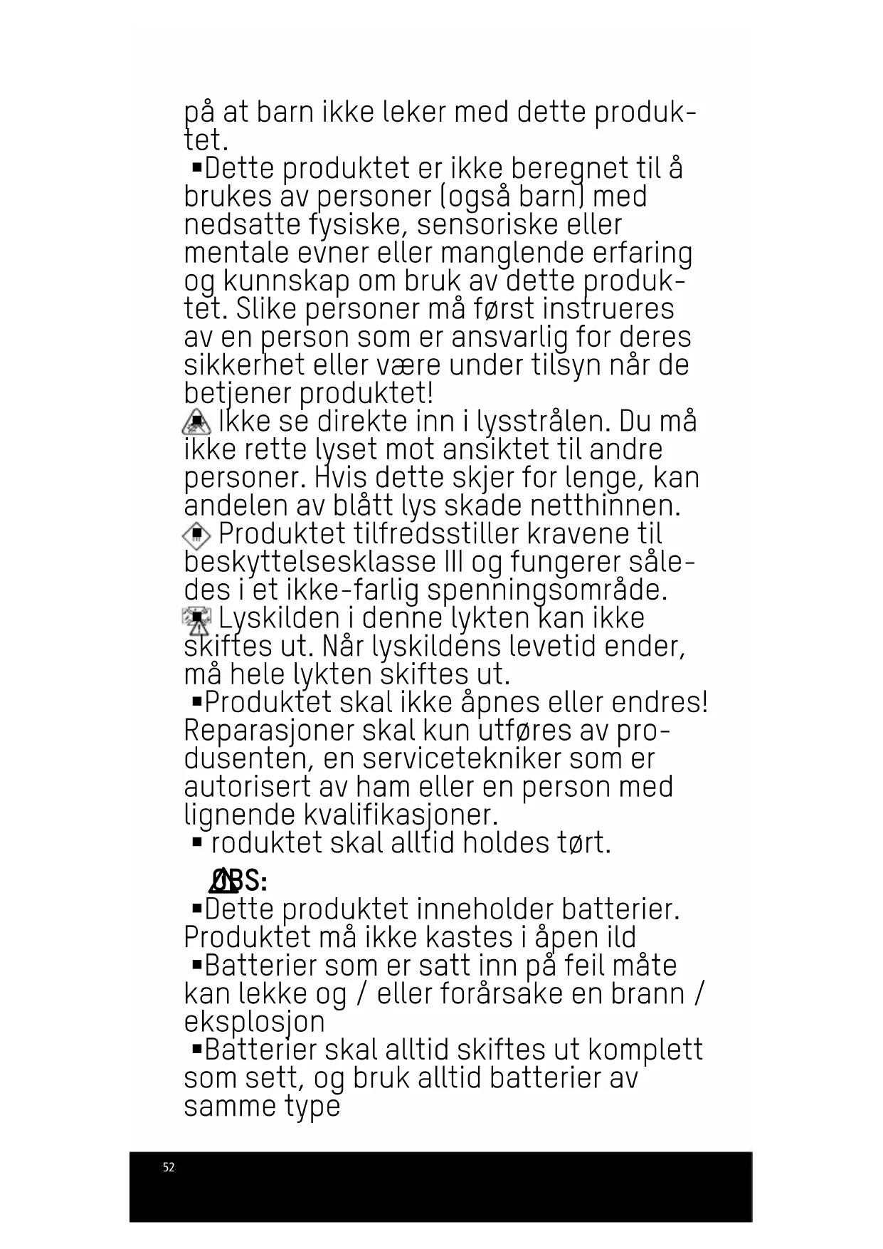 Produktet skal ikke øpnes eller endres! Reparasjoner skal kun utføres av produsenten, en servicetekniker som er autorisert av ham eller en person med lignende kvalifikasjoner.