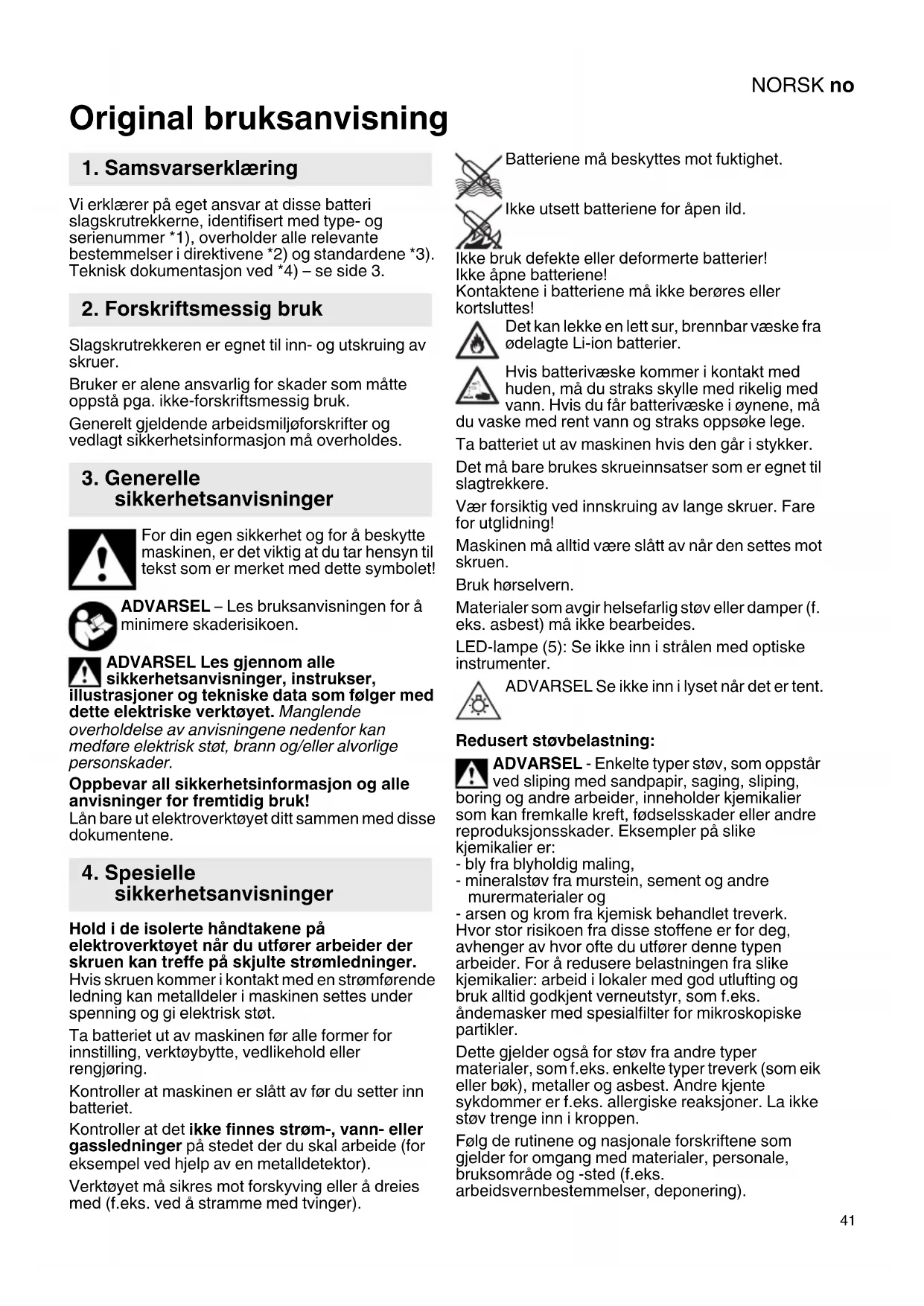 Original bruksanvisning Vi erklærer på eget ansvar at disse batteri slagskrutrekkerne, identifisert med type- og serienummer *1), overholder alle relevante bestemmelser i direktivene *2) og standardene *3). Teknisk dokumentasjon ved *4) – se side 3. Slagskrutrekkeren er egnet til inn- og utskruing av skruer. Bruker er alene ansvarlig for skader som måtte oppstå pga. ikke-forskriftsmessig bruk. Generelt gjeldende arbeidsmiljøforskrifter og vedlagt sikkerhetsinformasjon må overholdes. For din egen sikkerhet og for å beskytte maskinen, er det viktig at du tar hensyn til tekst som er merket med dette symbolet! ADVARSEL – Les bruksanvisningen for å minimere skaderisikoen. ADVARSEL Les gjennom alle sikkerhetsanvisninger, instrukser, illustrasjoner og tekniske data som følger med dette elektriske verktøyet. Manglende overholdelse av anvisningene nedenfor kan medføre elektrisk støt, brann og/eller alvorlige personskader. Oppbevar all sikkerhetsinformasjon og alle anvisninger for fremtidig bruk! Lån bare ut elektroverktøyet ditt sammen med disse dokumentene. Hold i de isolerte håndtakene på elektroverktøyet når du utfører arbeider der skruen kan treffe på skjulte strømledninger. Hvis skruen kommer i kontakt med en strømførende ledning kan metalldeler i maskinen settes under spenning og gi elektrisk støt. Ta batteriet ut av maskinen før alle former for innstilling, verktøybytte, vedlikehold eller rengjøring. Kontroller at maskinen er slått av før du setter inn batteriet. Kontroller at det ikke finnes strøm-, vann- eller gassledninger på stedet der du skal arbeide (for eksempel ved hjelp av en metalldetektor). Verktøyet må sikres mot forskyving eller å dreies med (f.eks. ved å stramme med tvinger). Batteriene må beskyttes mot fuktighet. Ikke utsett batteriene for åpen ild. Ikke bruk defekte eller deformerte batterier! Ikke åpne batteriene! Kontaktene i batteriene må ikke berøres eller kortsluttes! Det kan lekke en lett sur, brennbar væske fra ødelagte Li-ion batterier. Hvis batterivæske kommer i kontakt med huden, må du straks skylle med rikelig med vann. Hvis du får batterivæske i øynene, må du vaske med rent vann og straks oppsøke lege. Ta batteriet ut av maskinen hvis den går i stykker. Det må bare brukes skrueinnsatser som er egnet til slagtrekkere. Vær forsiktig ved innskruing av lange skruer. Fare for utglidning! Maskinen må alltid være slått av når den settes mot skruen. Bruk hørselvern. Materialer som avgir helsefarlig støv eller damper (f. eks. asbest) må ikke bearbeides. LED-lampe (5): Se ikke inn i strålen med optiske instrumenter. ADVARSEL Se ikke inn i lyset når det er tent. Redusert støvbelastning: ADVARSEL - Enkelte typer støv, som oppstår ved sliping med sandpapir, saging, sliping, boring og andre arbeider, inneholder kjemikalier som kan fremkalle kreft, fødselsskader eller andre reproduksjonsskader. Eksempler på slike kjemikalier er: - bly fra blyholdig maling, - mineralstøv fra murstein, sement og andre murermaterialer og - arsen og krom fra kjemisk behandlet treverk. Hvor stor risikoen fra disse stoffene er for deg, avhenger av hvor ofte du utfører denne typen arbeider. For å redusere belastningen fra slike kjemikalier: arbeid i lokaler med god utlufting og bruk alltid godkjent verneutstyr, som f.eks. åndemasker med spesialfilter for mikroskopiske partikler. Dette gjelder også for støv fra andre typer materialer, som f.eks. enkelte typer treverk (som eik eller bøk), metaller og asbest. Andre kjente sykdommer er f.eks. allergiske reaksjoner. La ikke støv trenge inn i kroppen. Følg de rutinene og nasjonale forskriftene som gjelder for omgang med materialer, personale, bruksområde og -sted (f.eks. arbeidsvernbestemmelser, deponering).