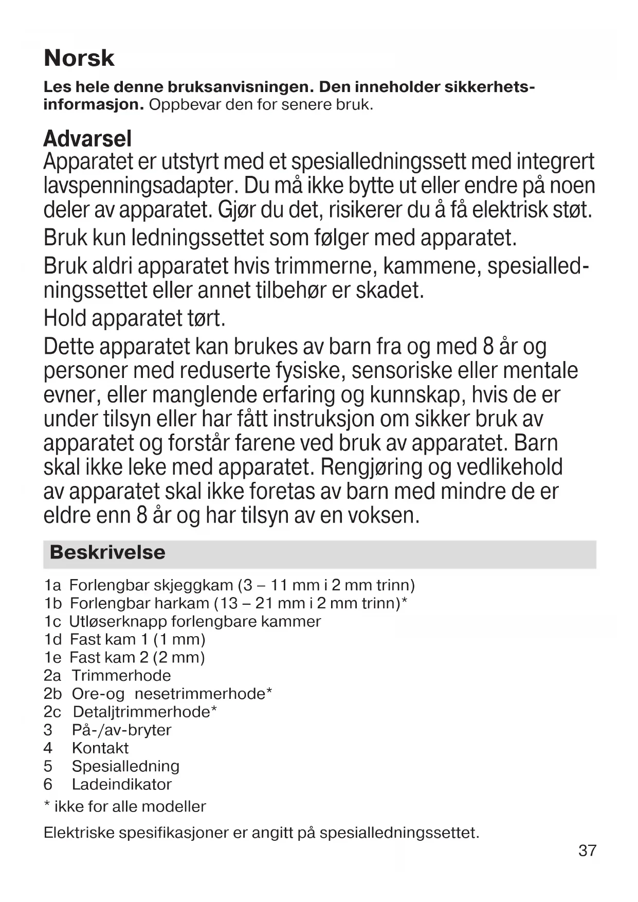 - Trimmerhodet og kammer kan rengjøres under rennende vann når de er tatt av apparatet. La dem tørke helt før de settes på igjen.