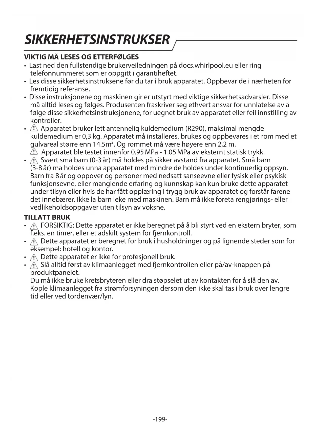 - Den utvendige temperaturen er under 18°C. Du må ikke forsøke å bruke klimaanlegget ditt i modus for kjøling når den utvendige temperaturen er under 18°C. Merk: Dersom problemene vedvarer, slå av apparatet og kople det fra strømforsyningen, ta deretter kontakt med ditt nærmeste godkjente Whirlpool Kundeservicesenter. Forsøk ikke å fjerne, reparere, demontere, eller endre på apparatet på egenhånd.-213- SERVICE-AVDELING Før du kontakter kundeservice: