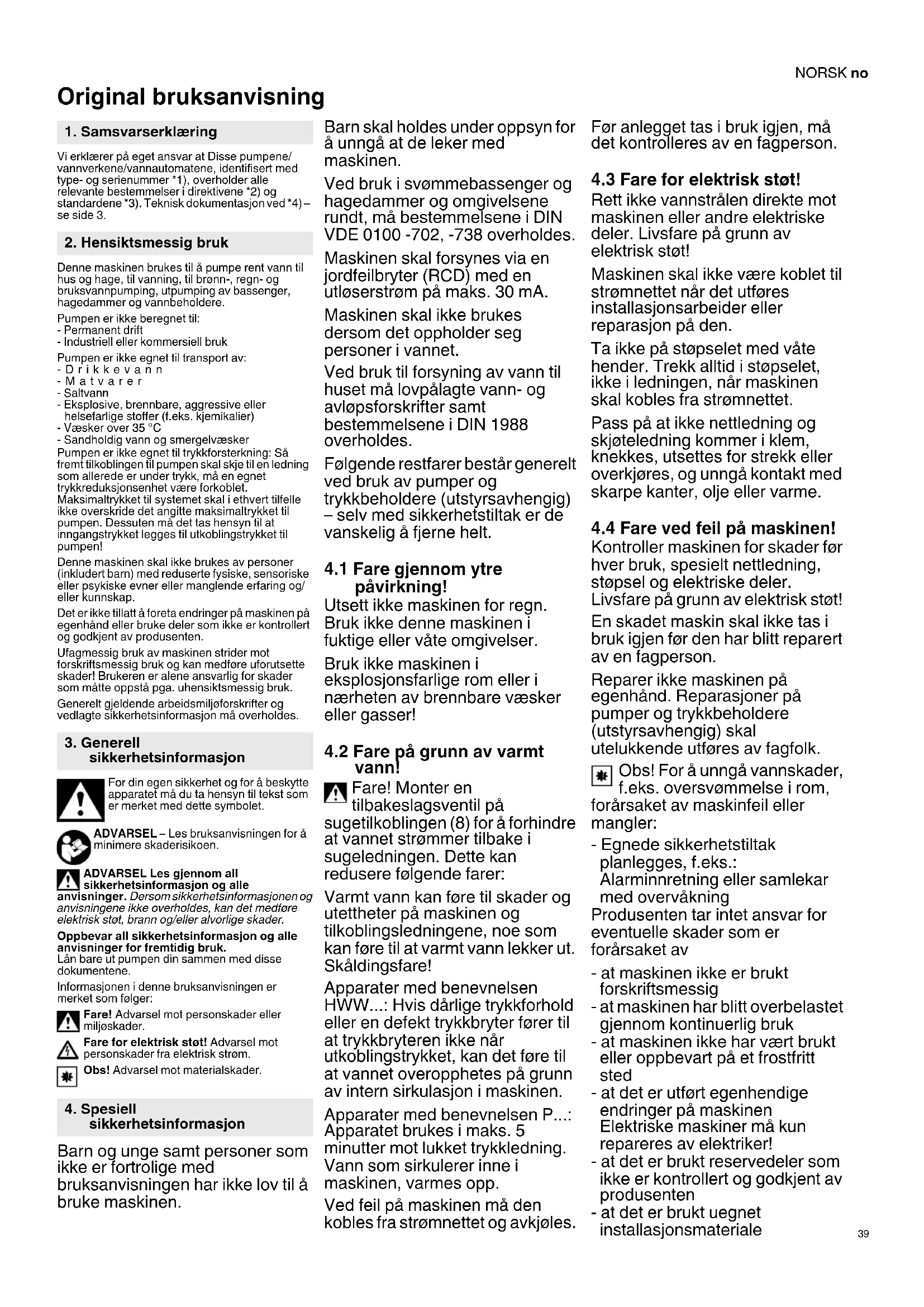 Original bruksanvisning Vi erklærer på eget ansvar at Disse pumpene/ vannverkene/vannautomatene, identifisert med type- og serienummer *1), overholder alle relevante bestemmelser i direktivene *2) og standardene *3). Teknisk dokumentasjon ved *4) – se side 3. Denne maskinen brukes til å pumpe rent vann til hus og hage, til vanning, til brønn-, regn- og bruksvannpumping, utpumping av bassenger, hagedammer og vannbeholdere. Pumpen er ikke beregnet til: - Permanent drift - Industriell eller kommersiell bruk Pumpen er ikke egnet til transport av: -Drikkevann -Matvarer - Saltvann - Eksplosive, brennbare, aggressive eller helsefarlige stoffer (f.eks. kjemikalier) - Væsker over 35 °C - Sandholdig vann og smergelvæsker Pumpen er ikke egnet til trykkforsterkning: Så fremt tilkoblingen til pumpen skal skje til en ledning som allerede er under trykk, må en egnet trykkreduksjonsenhet være forkoblet. Maksimaltrykket til systemet skal i ethvert tilfelle ikke overskride det angitte maksimaltrykket til pumpen. Dessuten må det tas hensyn til at inngangstrykket legges til utkoblingstrykket til pumpen! Denne maskinen skal ikke brukes av personer (inkludert barn) med reduserte fysiske, sensoriske eller psykiske evner eller manglende erfaring og/ eller kunnskap. Det er ikke tillatt å foreta endringer på maskinen på egenhånd eller bruke deler som ikke er kontrollert og godkjent av produsenten. Ufagmessig bruk av maskinen strider mot forskriftsmessig bruk og kan medføre uforutsette skader! Brukeren er alene ansvarlig for skader som måtte oppstå pga. uhensiktsmessig bruk. Generelt gjeldende arbeidsmiljøforskrifter og vedlagte sikkerhetsinformasjon må overholdes. For din egen sikkerhet og for å beskytte apparatet må du ta hensyn til tekst som er merket med dette symbolet. ADVARSEL – Les bruksanvisningen for å minimere skaderisikoen. ADVARSEL Les gjennom all sikkerhetsinformasjon og alle anvisninger. Dersom sikkerhetsinformasjonen og anvisningene ikke overholdes, kan det medføre elektrisk støt, brann og/eller alvorlige skader. Oppbevar all sikkerhetsinformasjon og alle anvisninger for fremtidig bruk. Lån bare ut pumpen din sammen med disse dokumentene. Informasjonen i denne bruksanvisningen er merket som følger: Fare! Advarsel mot personskader eller miljøskader. Fare for elektrisk støt! Advarsel mot personskader fra elektrisk strøm. Obs! Advarsel mot materialskader. Barn og unge samt personer som ikke er fortrolige med bruksanvisningen har ikke lov til å bruke maskinen. Barn skal holdes under oppsyn for å unngå at de leker med maskinen. Ved bruk i svømmebassenger og hagedammer og omgivelsene rundt, må bestemmelsene i DIN VDE 0100 -702, -738 overholdes. Maskinen skal forsynes via en jordfeilbryter (RCD) med en utløserstrøm på maks. 30 mA. Maskinen skal ikke brukes dersom det oppholder seg personer i vannet. Ved bruk til forsyning av vann til huset må lovpålagte vann- og avløpsforskrifter samt bestemmelsene i DIN 1988 overholdes. Følgende restfarer består generelt ved bruk av pumper og trykkbeholdere (utstyrsavhengig) – selv med sikkerhetstiltak er de vanskelig å fjerne helt.